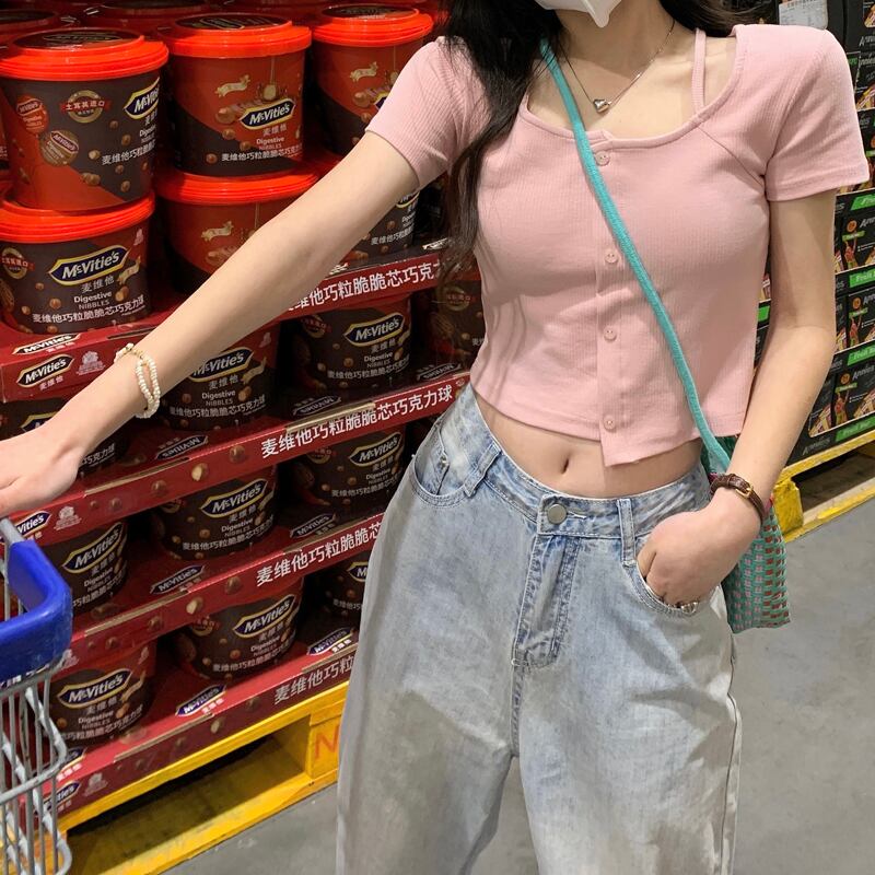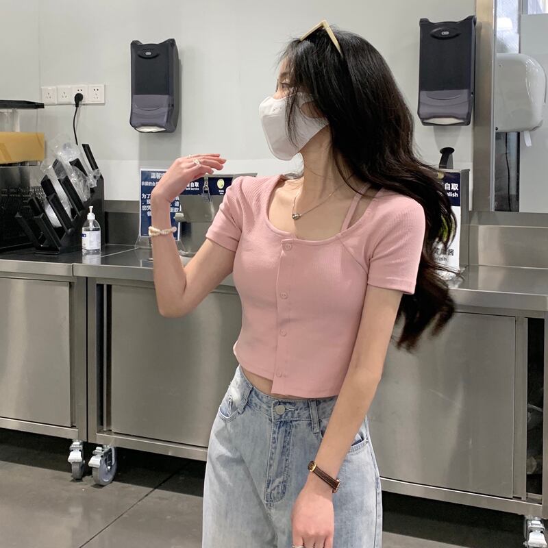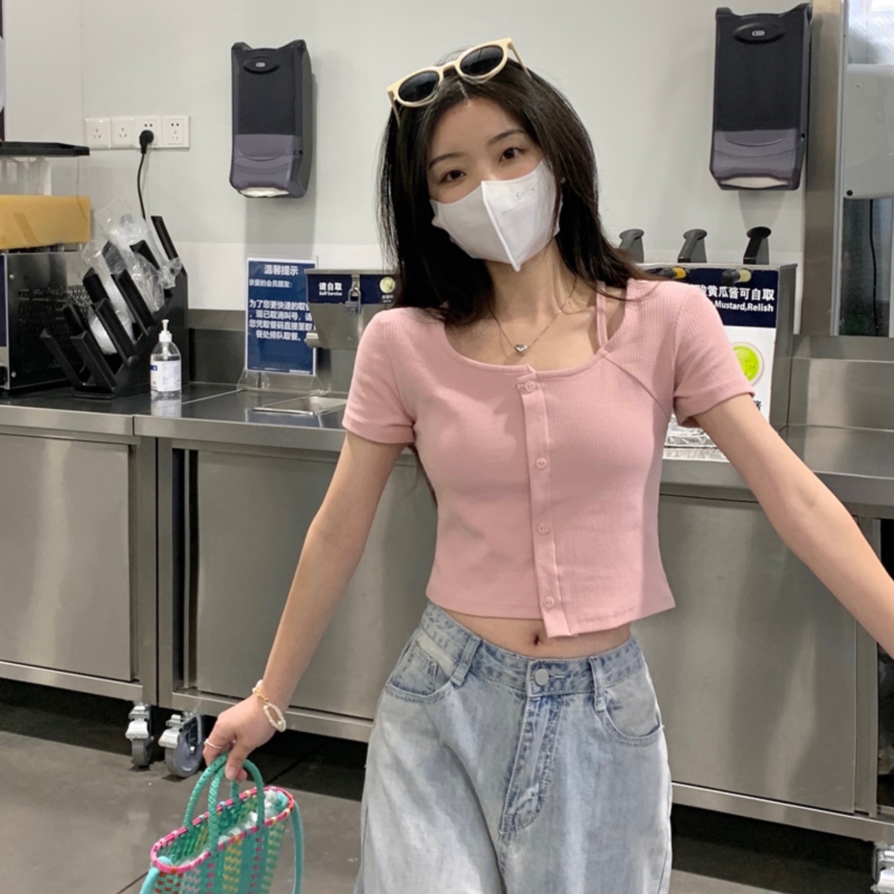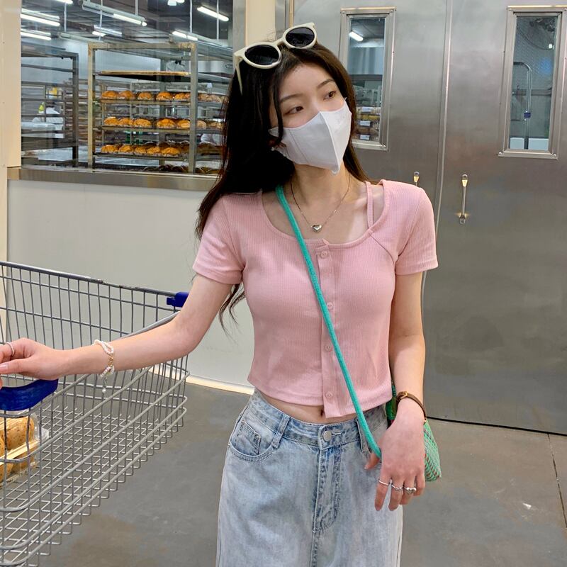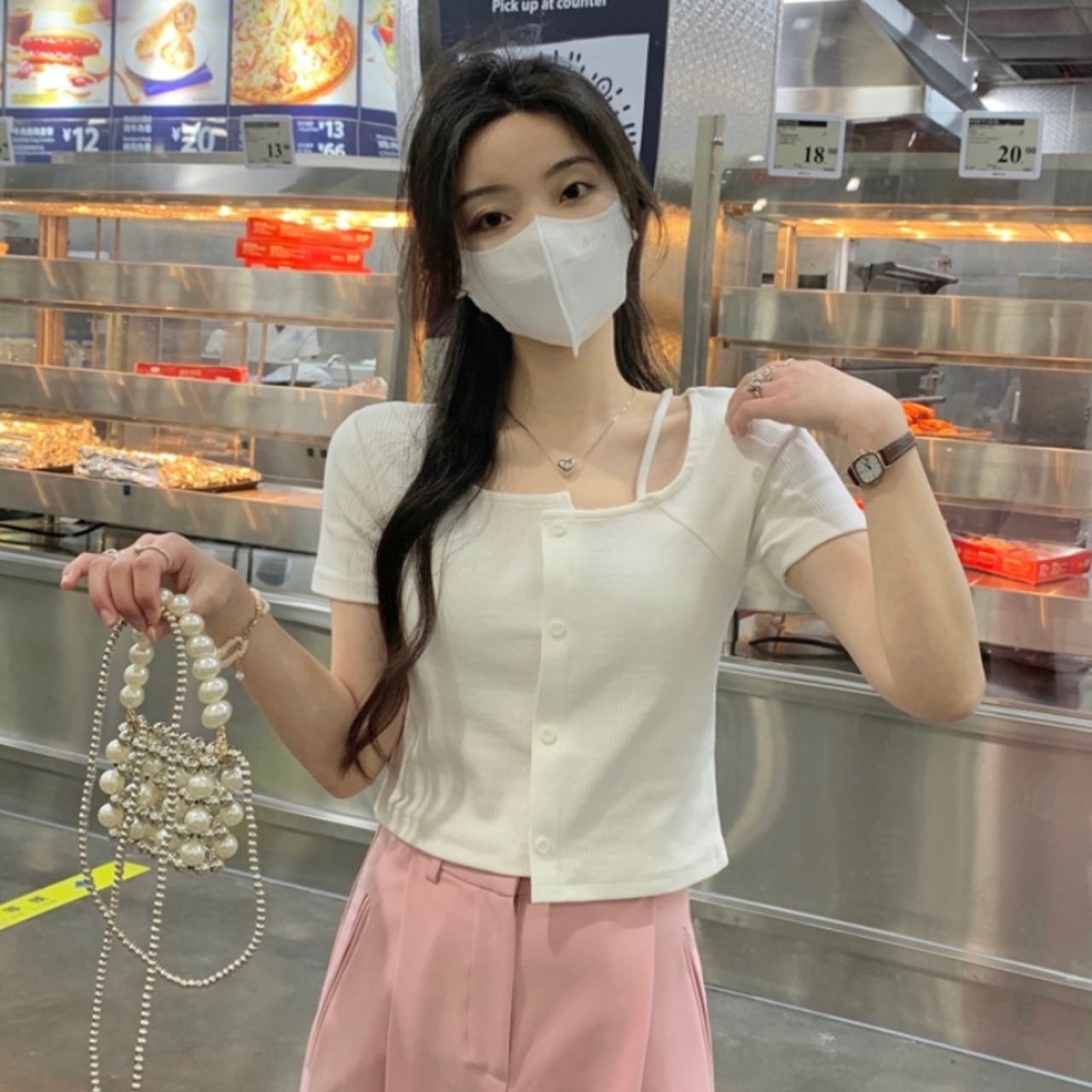 ショートスタイルトップス 夏服カラー半袖スリーブTシャツ ハーフスリーブ 大人ガーリー スウィート キュート カジュアル 夏物 ピュア スクウェア コーデ Marchs4986878852