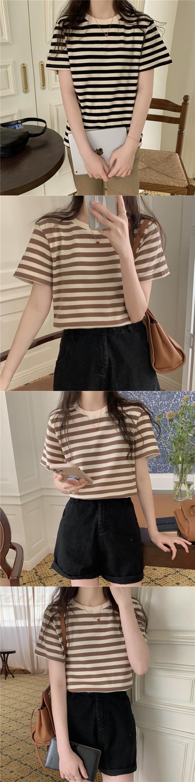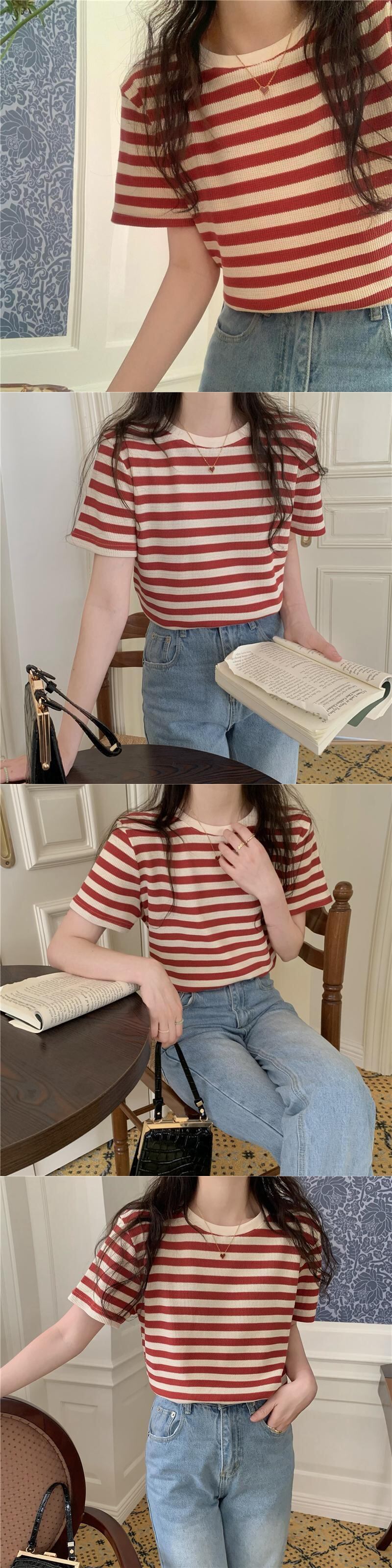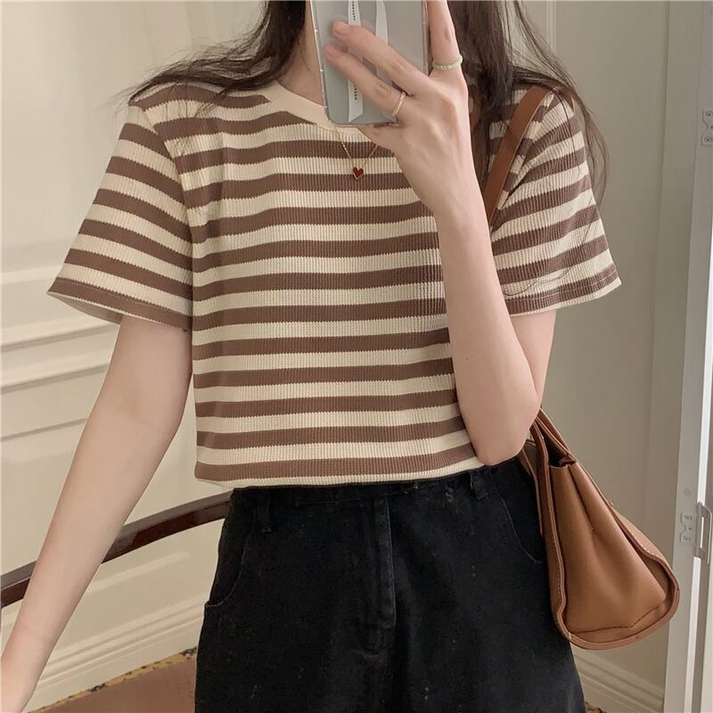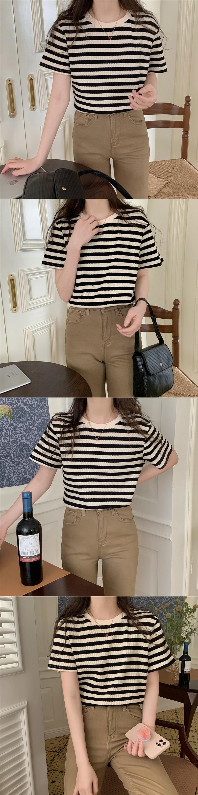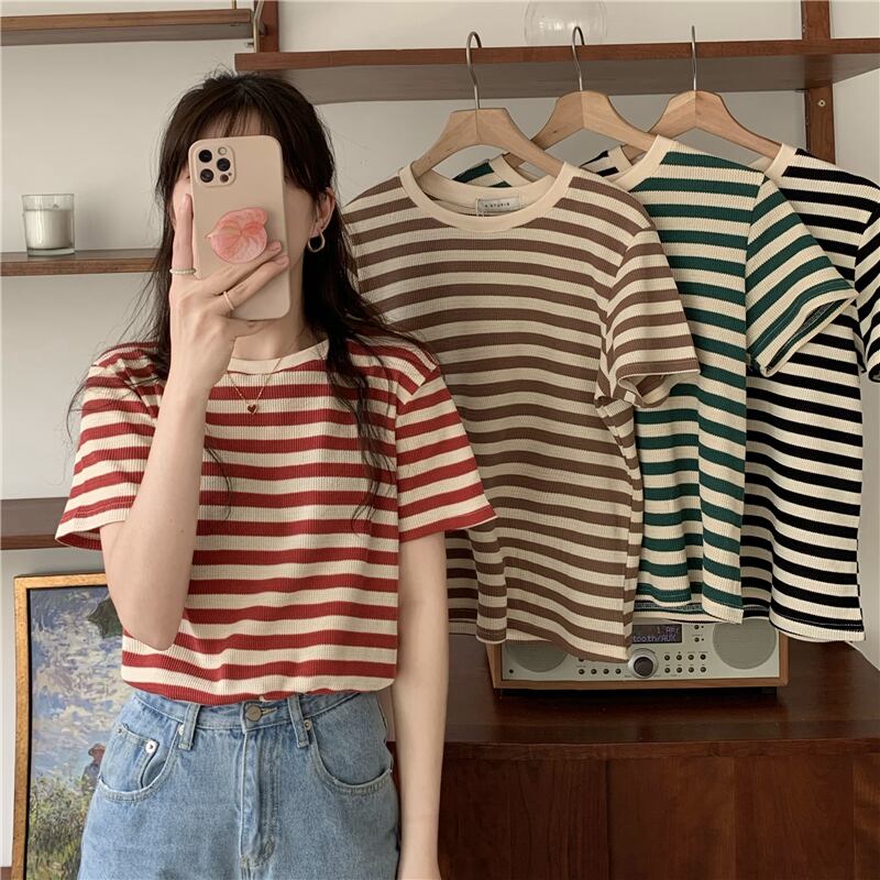 夏服カラーストライプTシャツスリムトップス 夏物 コーデ Marchs18479528248