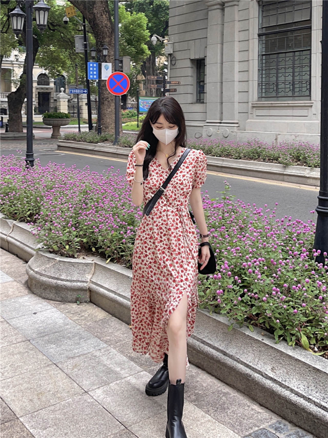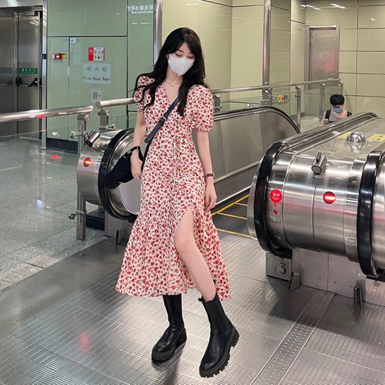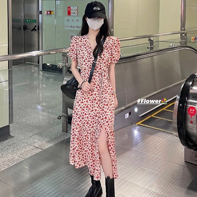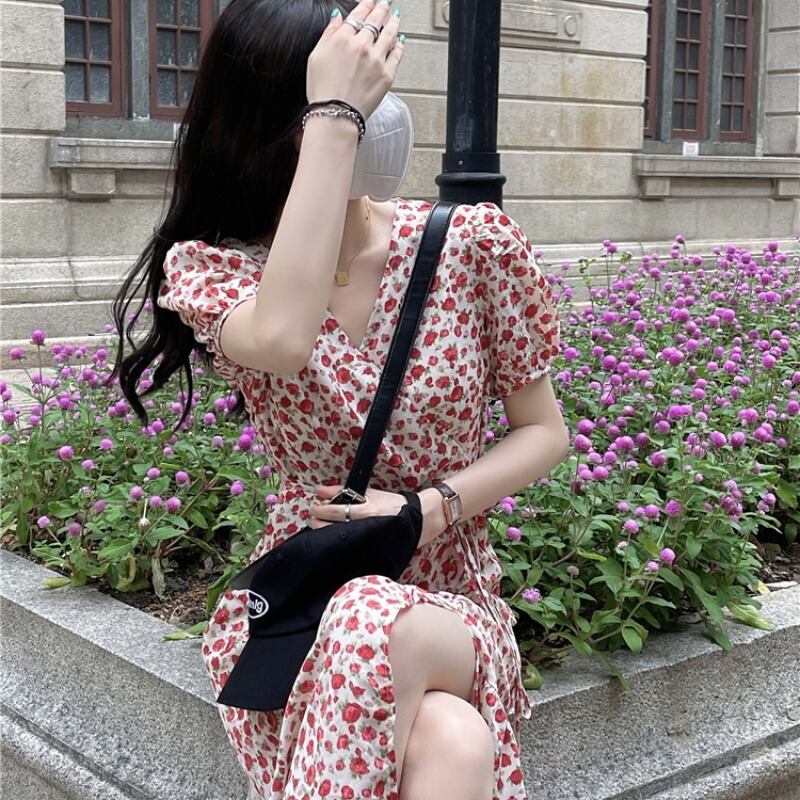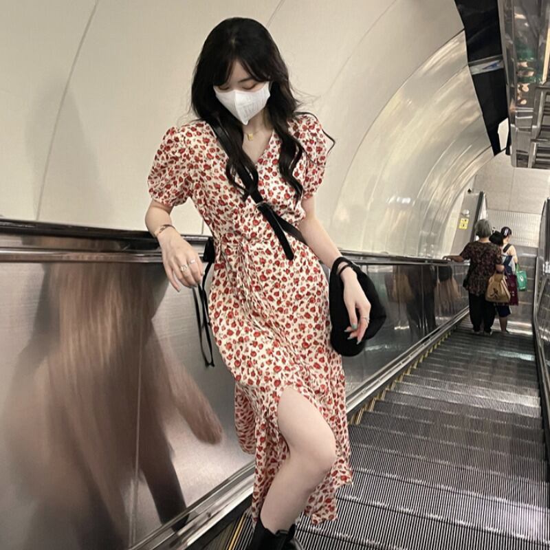 フローラルスカート NEWパフスリーブスリーブ夏服レディースVネックワンピース 大人ガーリー スウィート キュート カジュアル 夏物 花柄 コーデ Marchs34039722090
