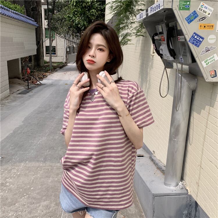 スタンダードストライプTシャツルーズ薄手夏服ラウンドネックトップス コットン レトロ 夏物 Oネック コーデ Marchs62299162703