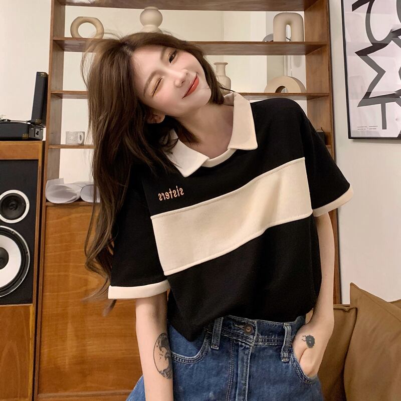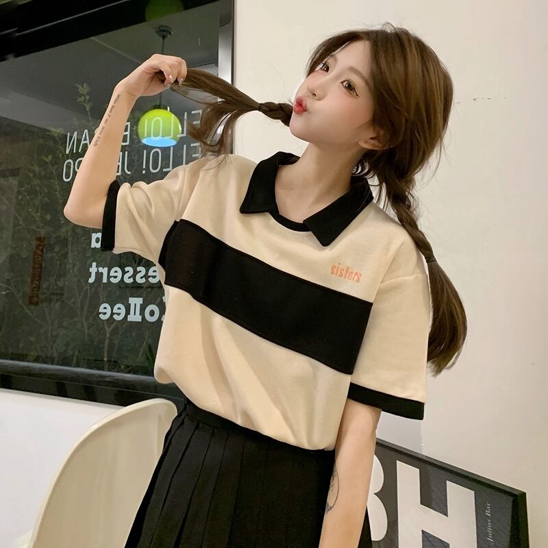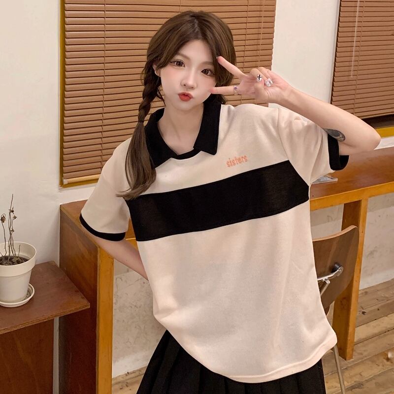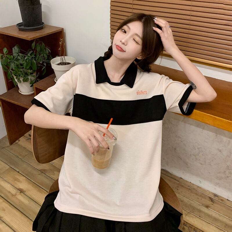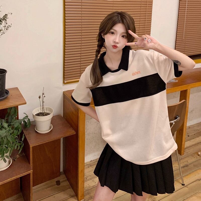 夏服ワンピースブラックトップス ルーズカラーTシャツ 夏物 コーデ Marchs75698306231
