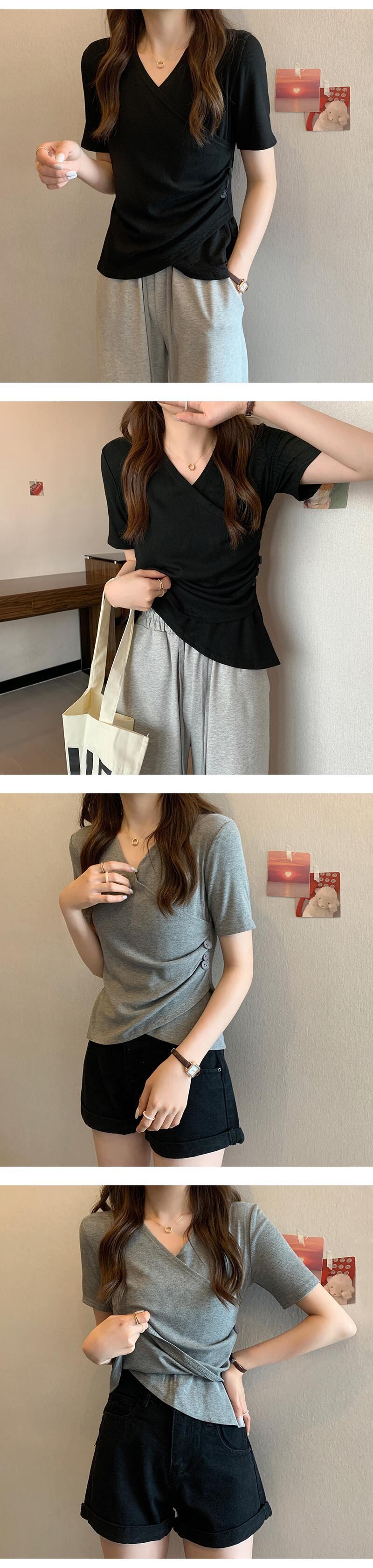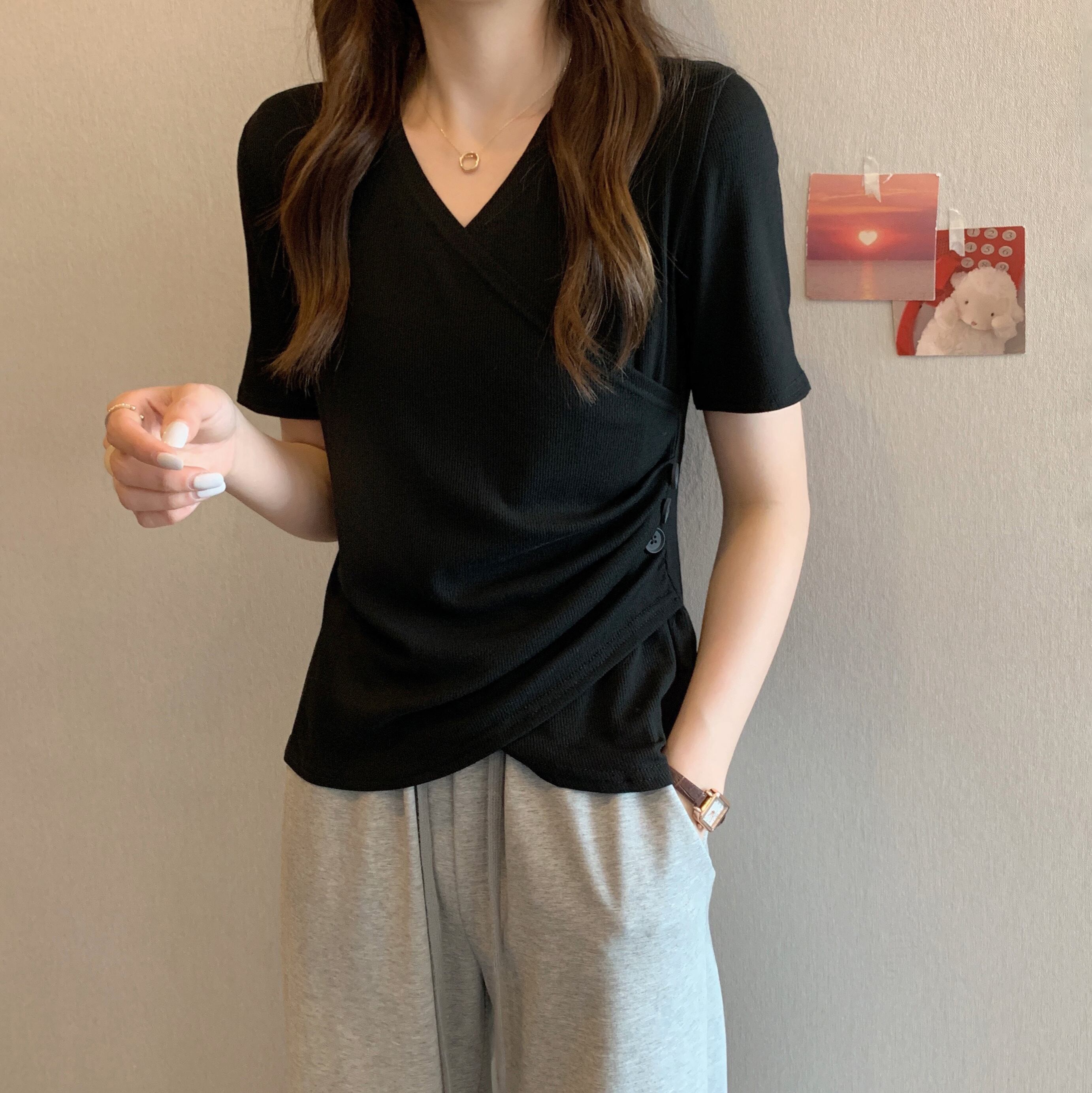 クロスVネックプリーツウェスト薄手Tシャツ夏服トップス 夏物 ウエスト コーデ Marchs62633792704