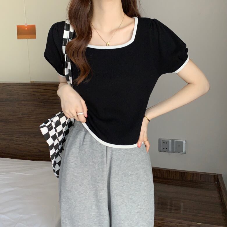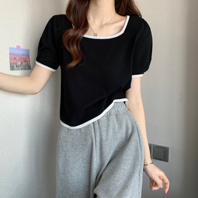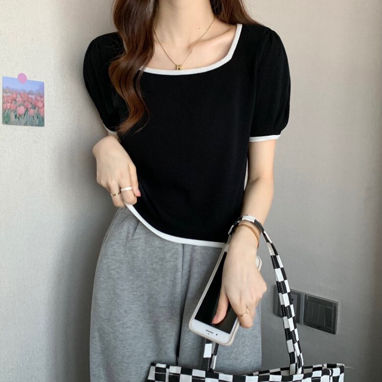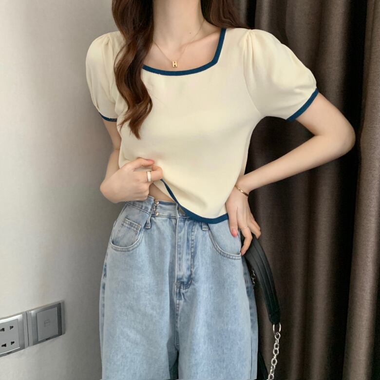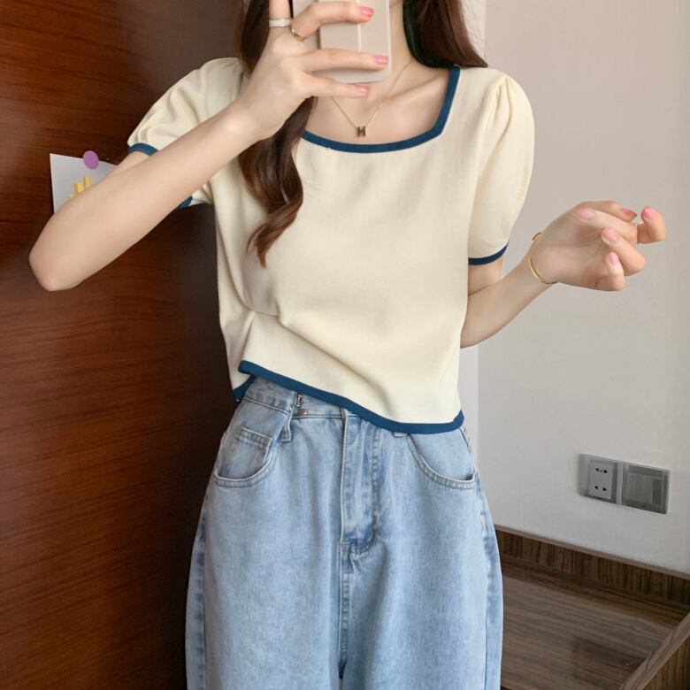 カラーショートTシャツ夏服薄手ニットセーター ワイドレッグパンツ トップス 夏物 ワイドパンツ シルク スクウェア コーデ Marchs75697642696