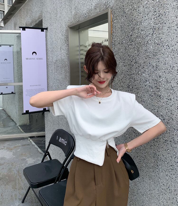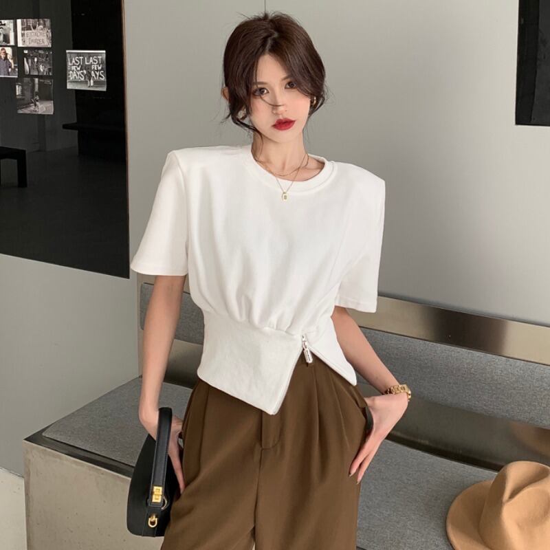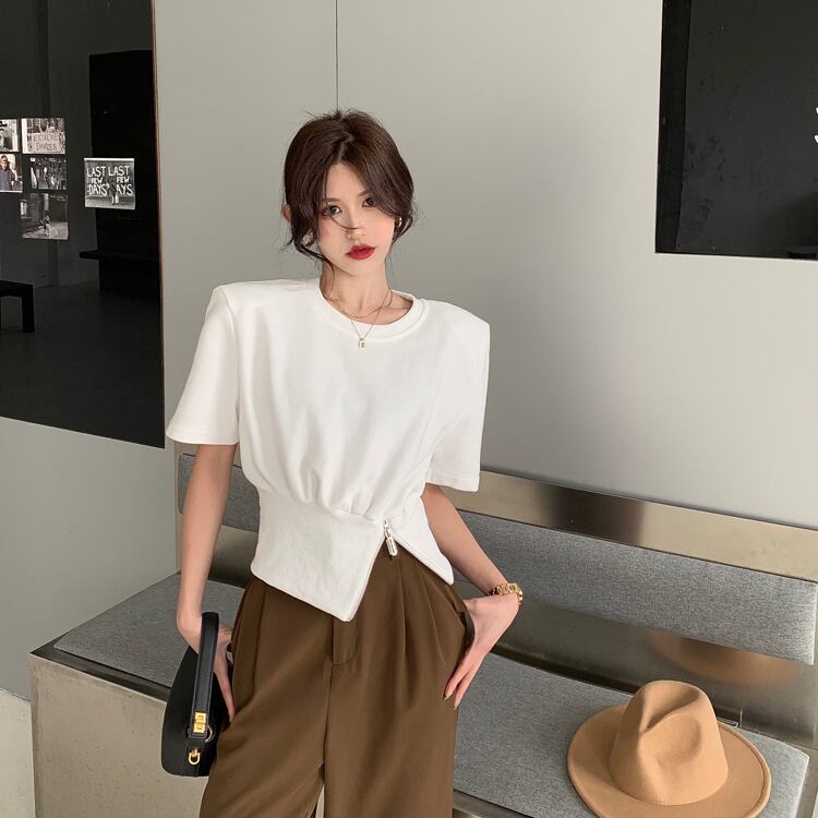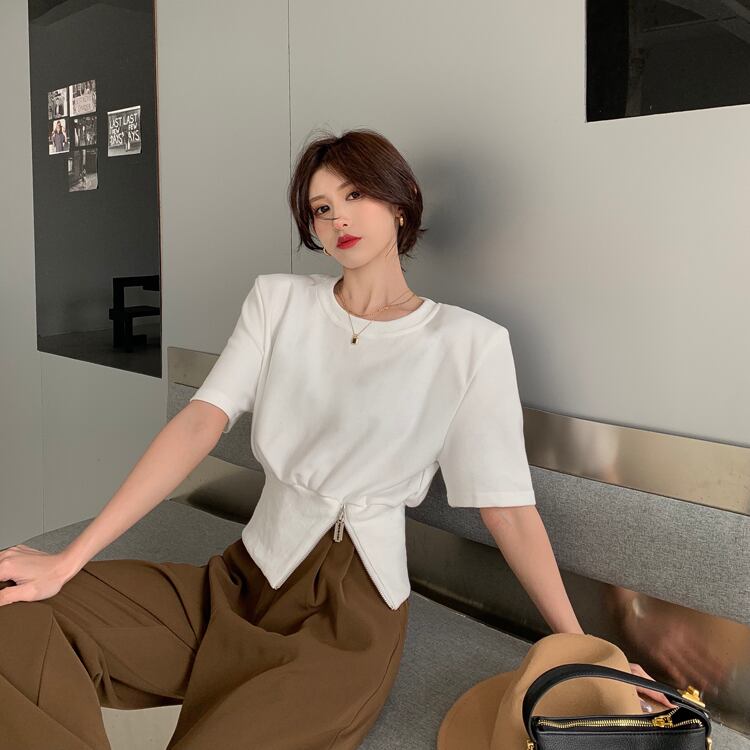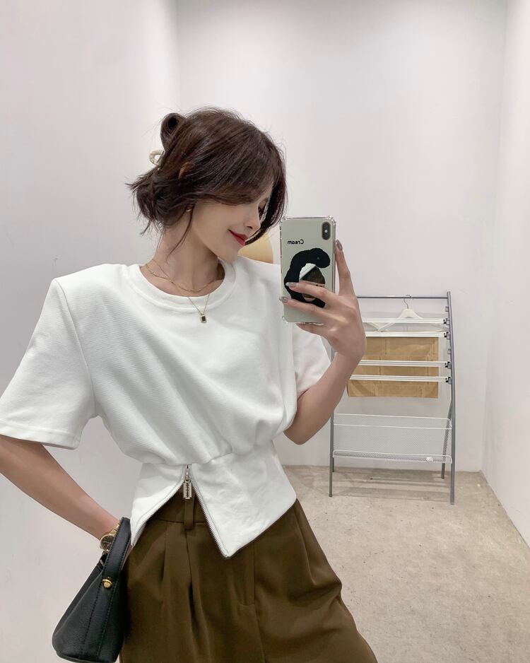 ホワイトショートTシャツ夏服ルーズジッパースリットトップス 夏物 コーデ Marchs79571383370