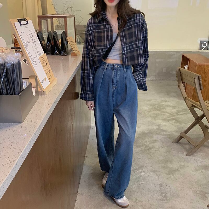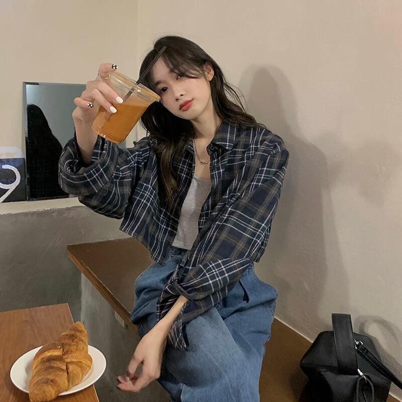 ブルーショート格子柄シャツ ジャケット 夏服薄手トップス 夏物 コーデ Marchs58623205791