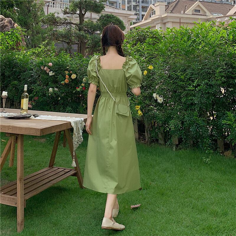 オレンジスカート 夏服グリーンロングカラースリーブワンピース 大人ガーリー スウィート キュート カジュアル 夏物 スクウェア コーデ Marchs67746983158