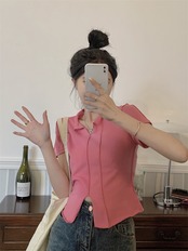 ウェストショートTシャツNEW夏服Vネックハイウェストトップス ピンク 夏物 ウエスト コーデ Marchs71110349026