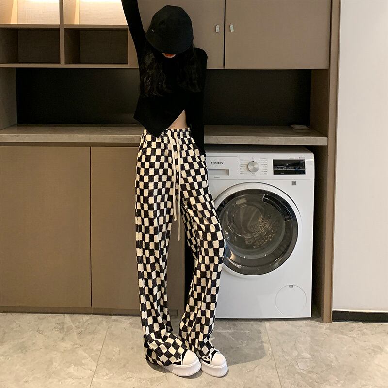 ブラックホワイト格子柄パンツ ハイウェストウェストスプリング夏服ルーズ薄手カジュアルスタンダード レトロ 春物 夏物 ウエスト コーデ Marchs89310599419