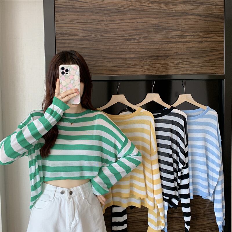 ブルーホワイトストライプTシャツシャツ 夏服薄手ルーズトップス ブラウス NEW ロング 夏物 長袖 コーデ Marchs26879330516
