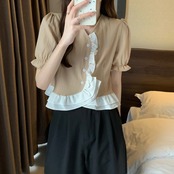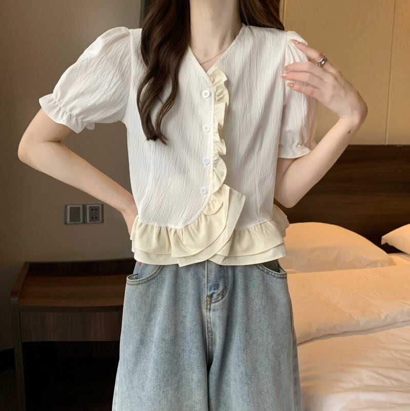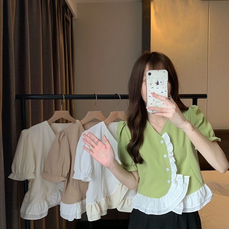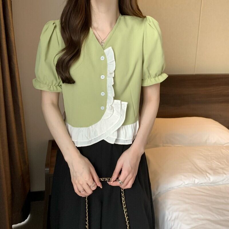 Vネックショートシャツ 夏服薄手トップス 夏物 コーデ Marchs42698946617