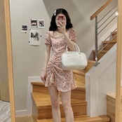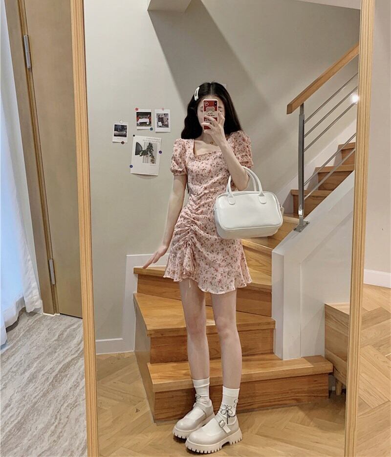 ウェストAラインショートスカート スタンダードシフォンプリーツフローラルワンピースレディース夏服 ピンク レトロ 夏物 花柄 スクウェア ウエスト コーデ Marchs83009593117