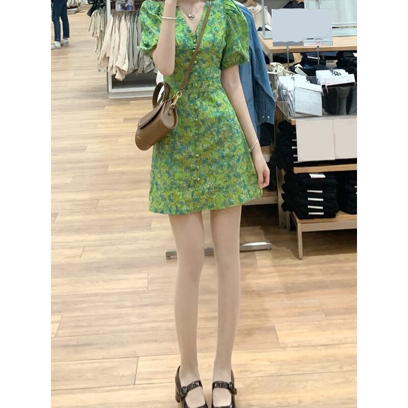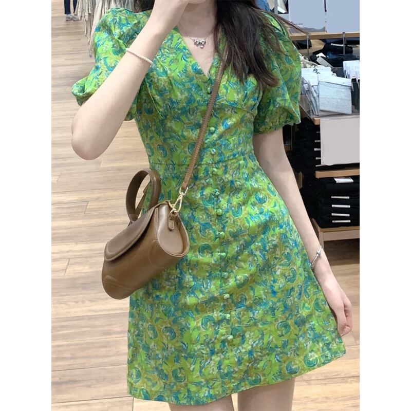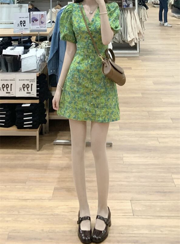 スタンダードワンピースVネックウェストフローラルスカート レディース夏服 レトロ 夏物 花柄 パフスリーブ ウエスト コーデ Marchs49810132610