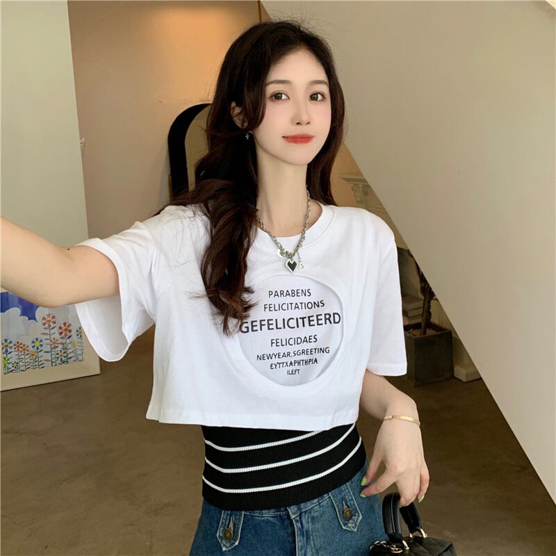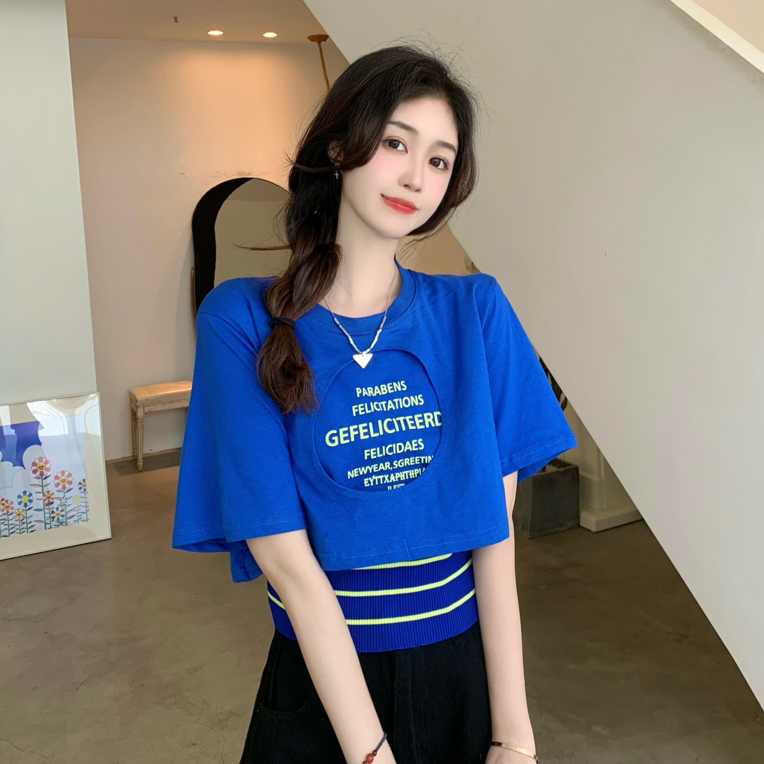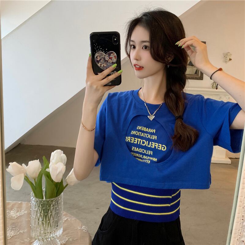 ストライプショートTシャツ夏服ブルー半袖スリーブハイウェストウェストトップス ハーフスリーブ 夏物 ステッチ ウエスト コーデ Marchs77747661253