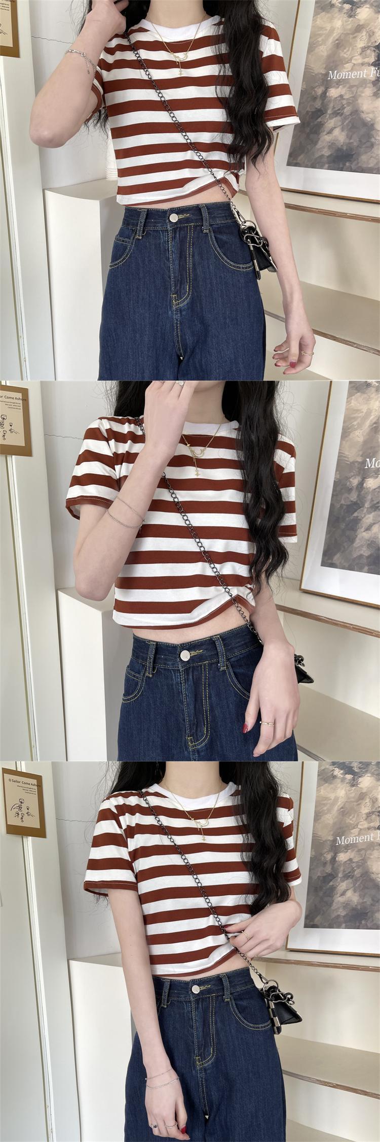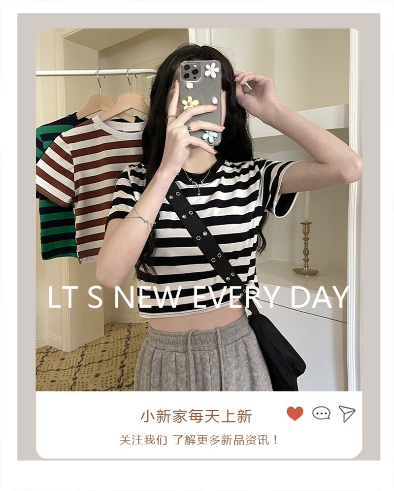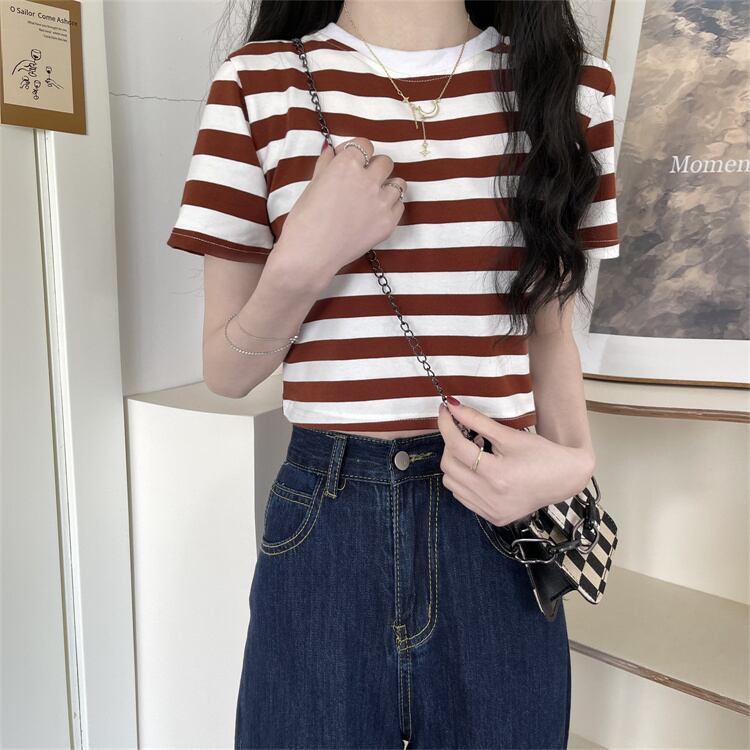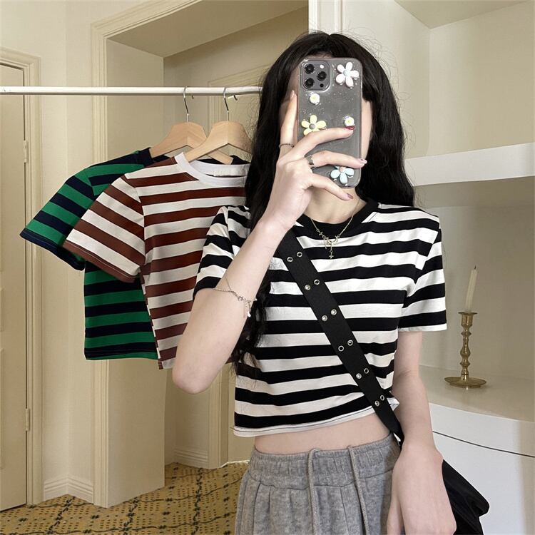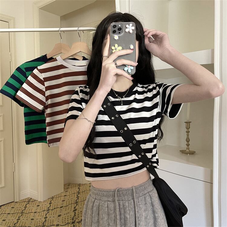 ブラックホワイトストライプショートTシャツ夏服ハイウェストウェストクロップドトップス NEW 夏物 ウエスト コーデ Marchs99242391891