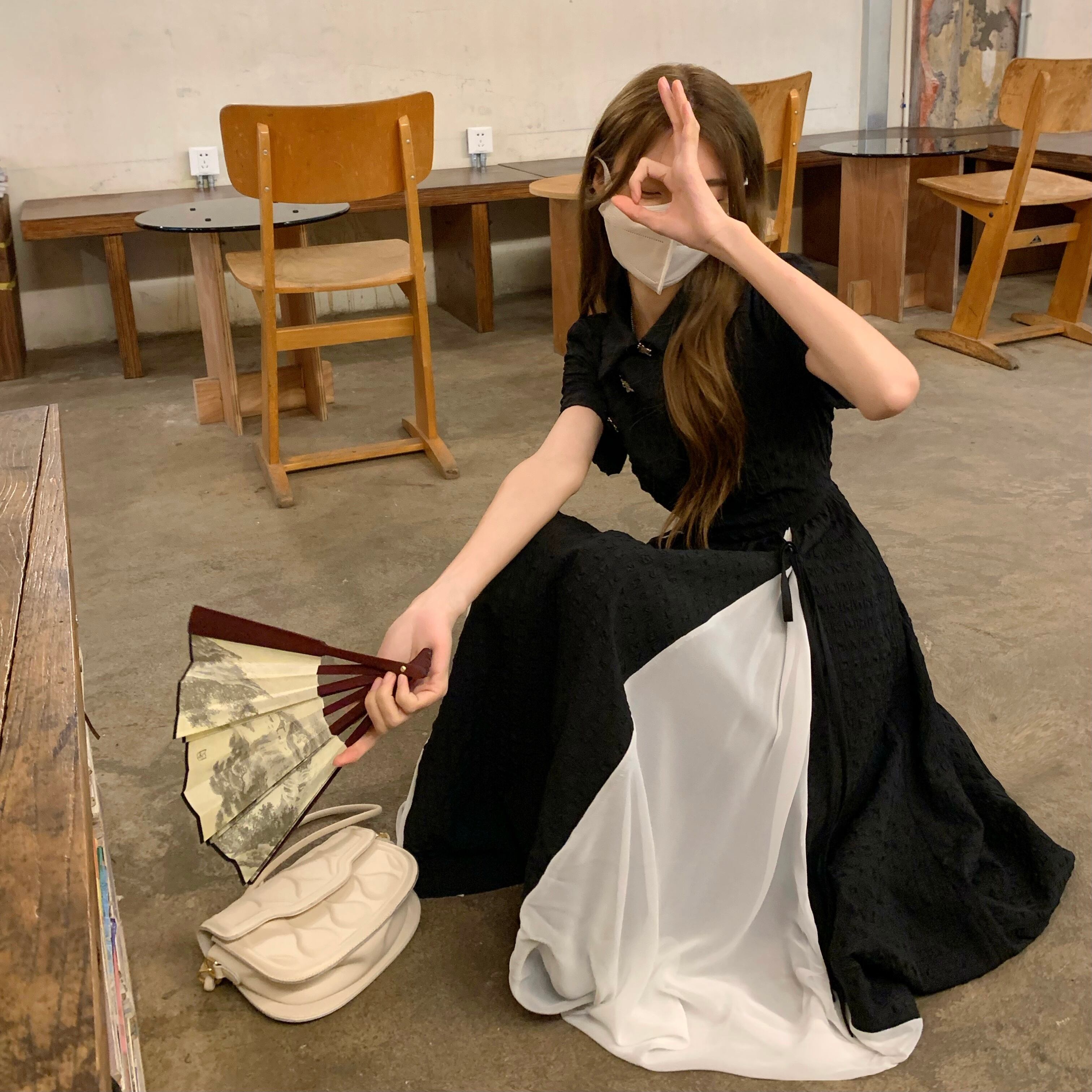 自然派スタイルボタンブラックワンピースレディース夏服スカート スタンダードウェスト レトロ 夏物 ウエスト ミドル丈 コーデ Marchs98146072820