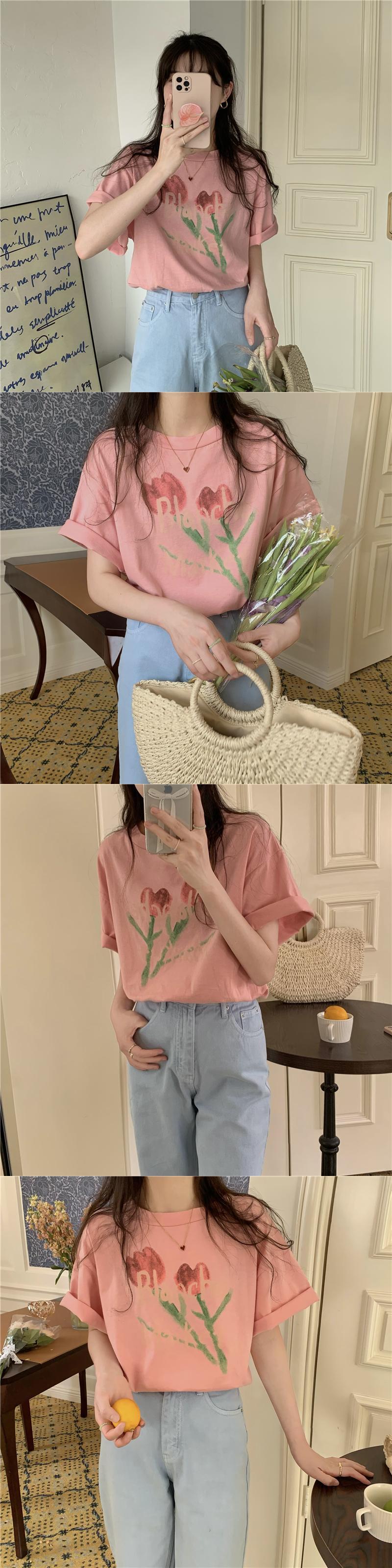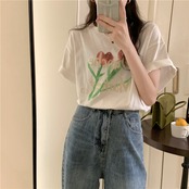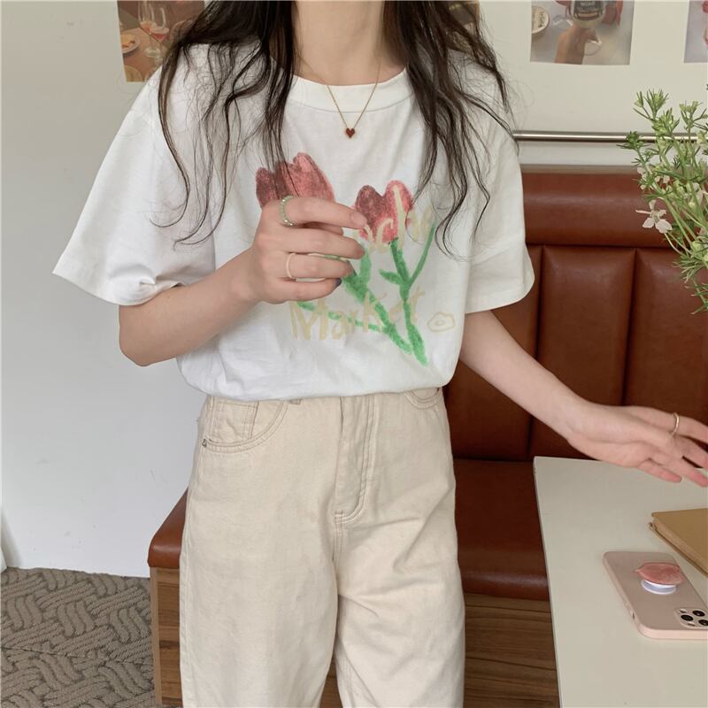 Tシャツ夏服ラウンドネックルーズプリント柄トップス コットン 夏物 Oネック コーデ Marchs66202596312