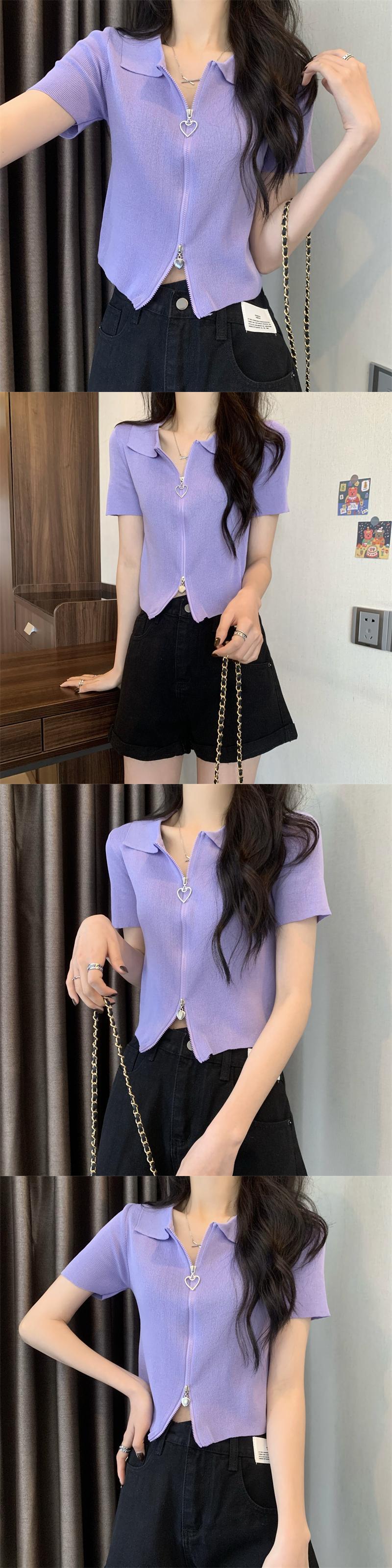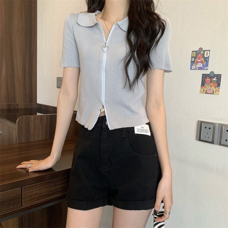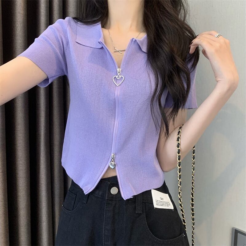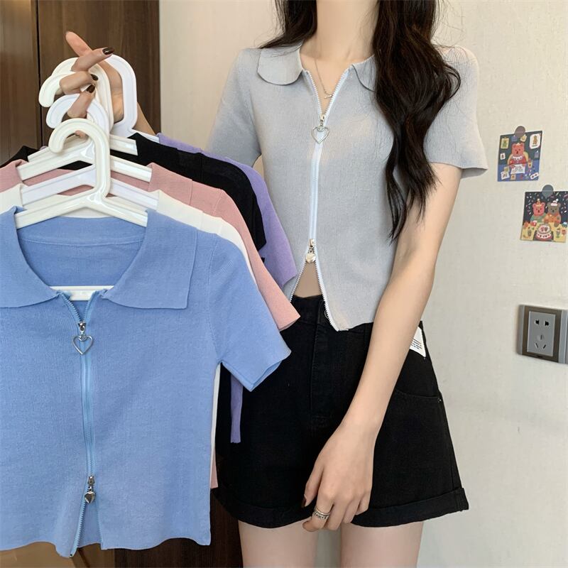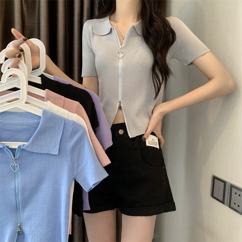 夏服薄手ニットセーター ショートTシャツシャツ ジッパーカラートップス 夏物 シルク コーデ Marchs66900454229