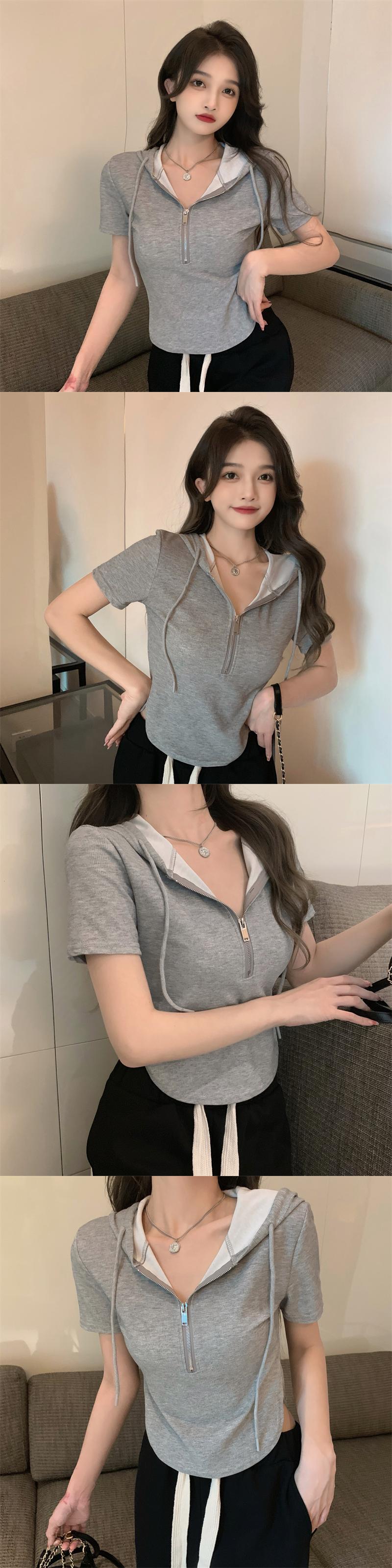スプリング夏服薄手ジッパーフードセーター ショートTシャツトップス 春物 夏物 コーデ Marchs21012035143