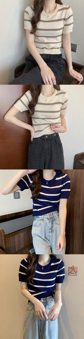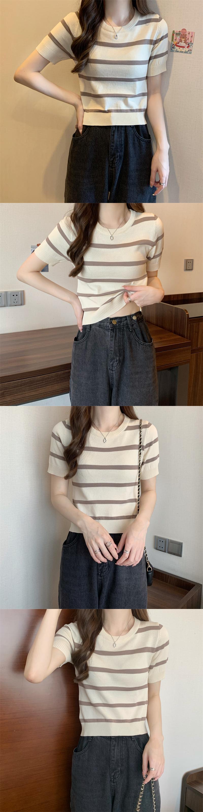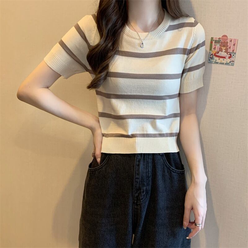 ストライプショートトップス 夏服薄手セーター スリムフィットハイウェストウェスト半袖スリーブTシャツ ハーフスリーブ 夏物 シルク ウエスト コーデ Marchs21821291916
