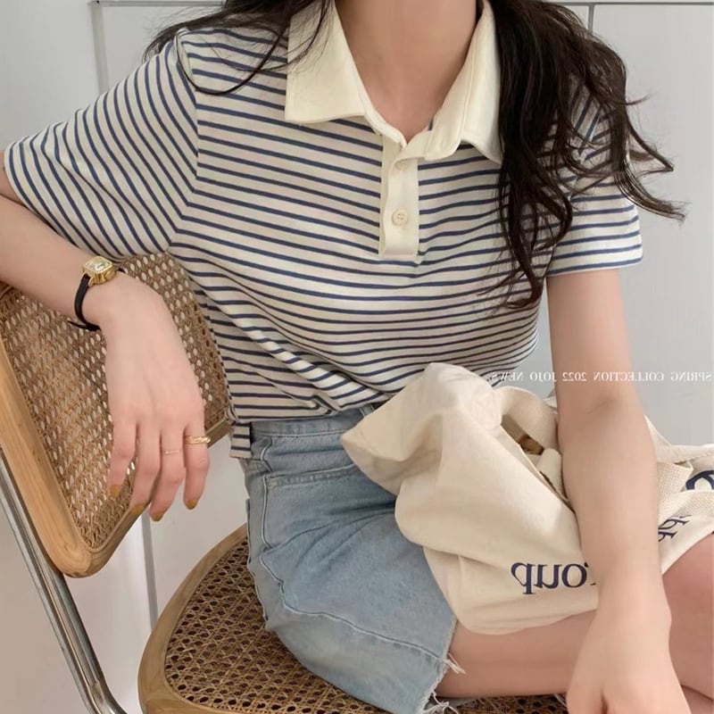 ストライプカラーTシャツ夏服韓国ファッションルーズトップス コットン 夏物 コーデ Marchs71724643126