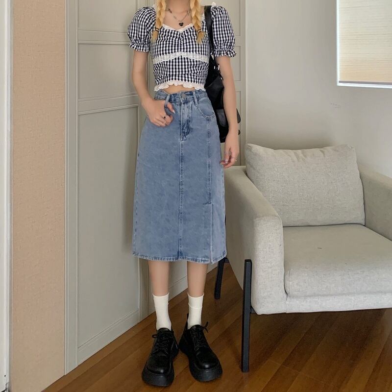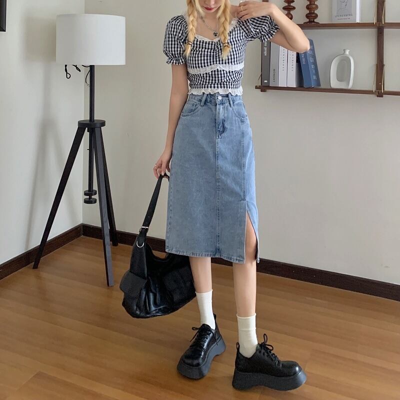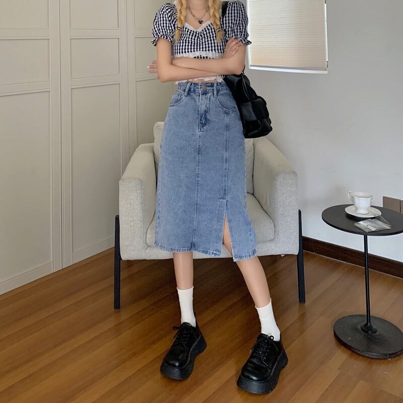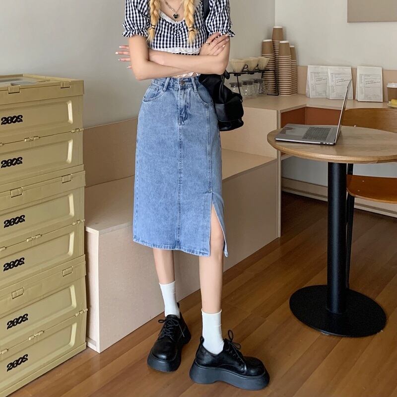 サイドスリットスカート 夏服薄手ハイウェストウェストブルーAライン 夏物 ウエスト コーデ Marchs52677843605