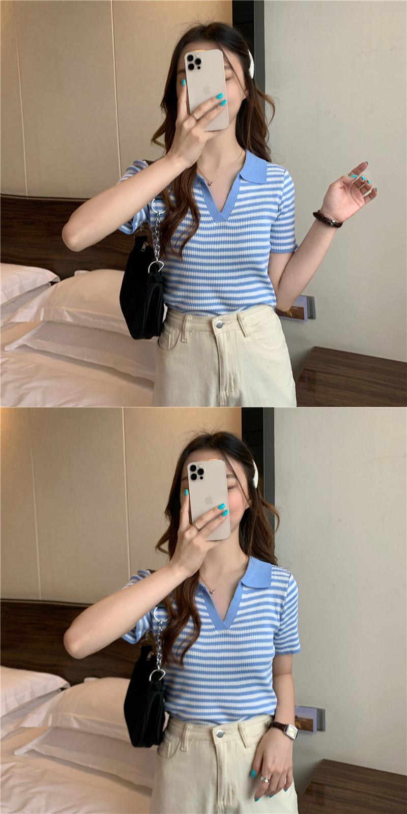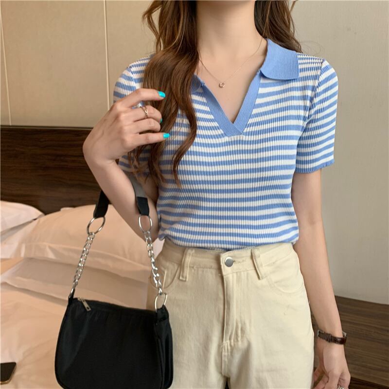 スタイルハイウェストウェストストライプシャツ ショートトップス 夏服薄手TシャツNEW 大人ガーリー スウィート キュート カジュアル 夏物 ウエスト コーデ Marchs79700600538