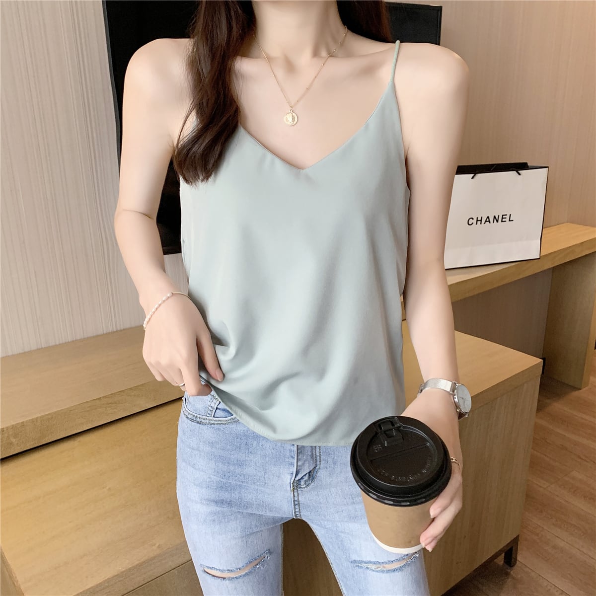 シフォンホワイト夏服Vネックノースリーブトップス 薄手ゆったりシャツ 夏物 コーデ Marchs11855498970