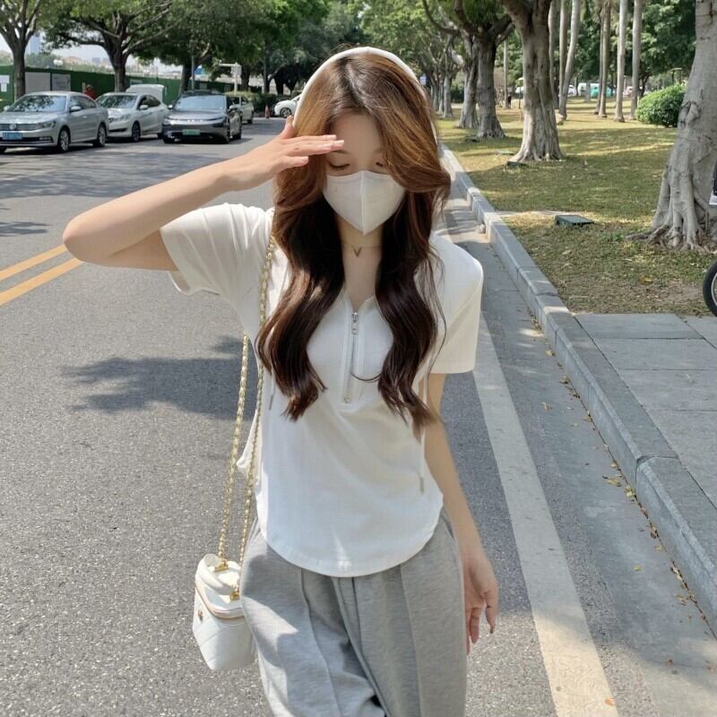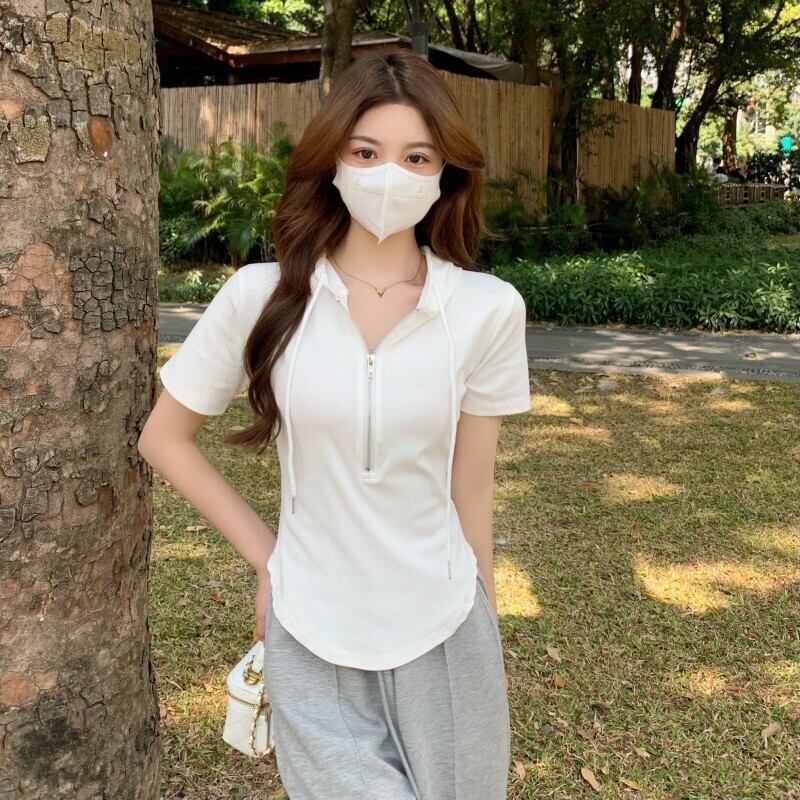ホワイトフードTシャツスリムトップス 夏服 夏物 ピュア コーデ Marchs24941493467