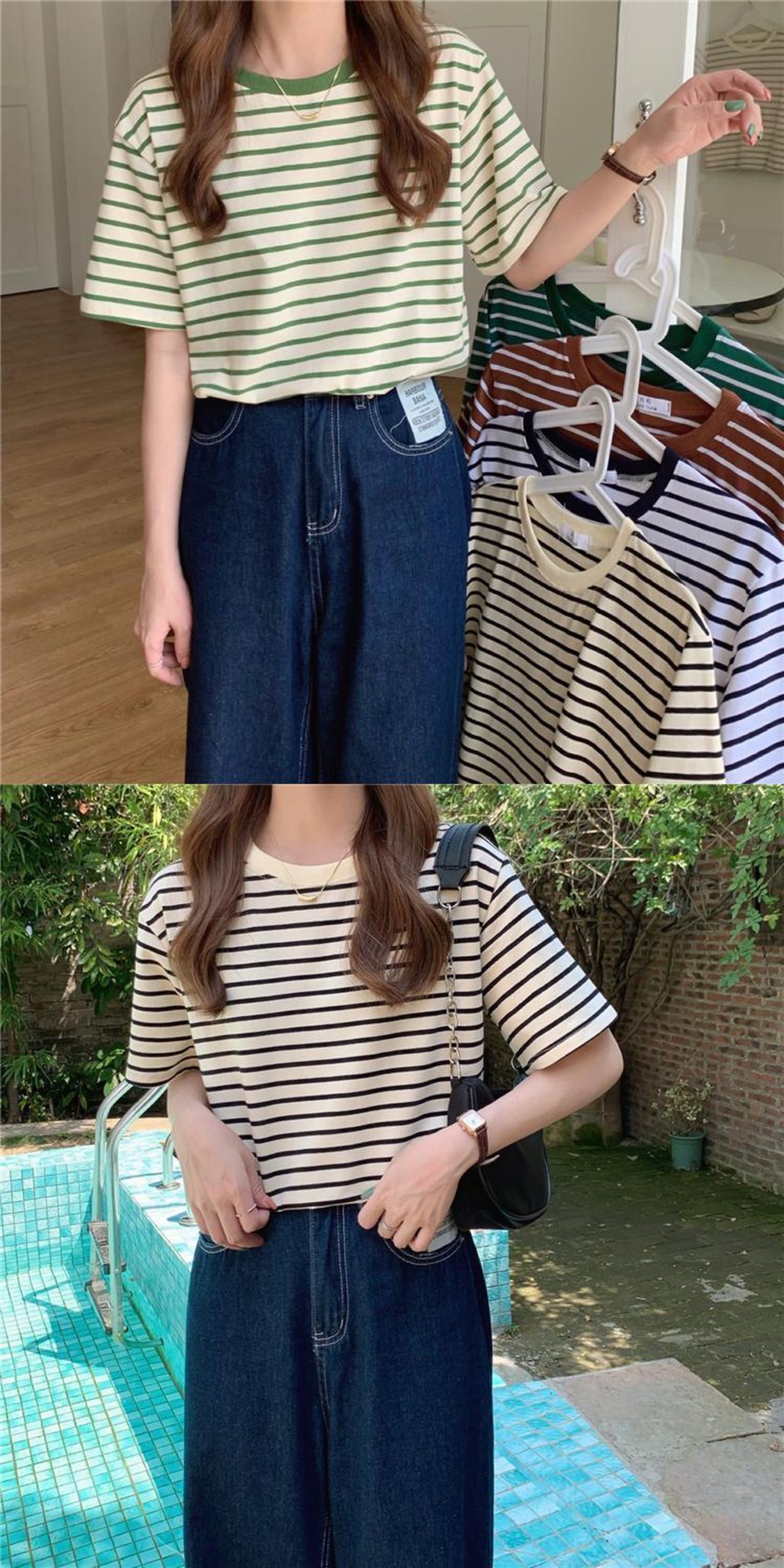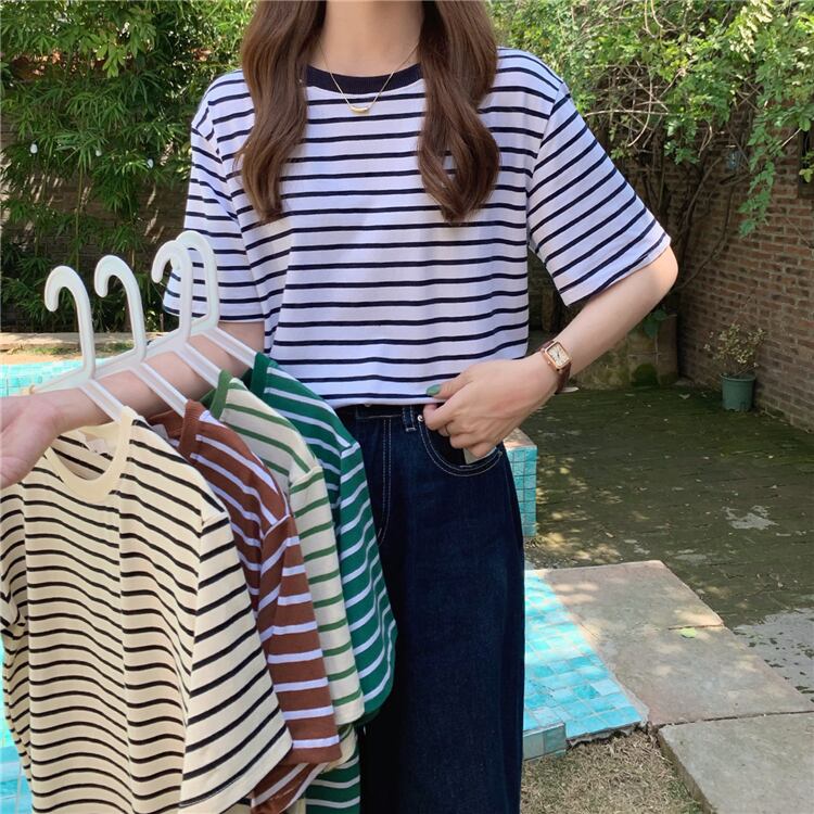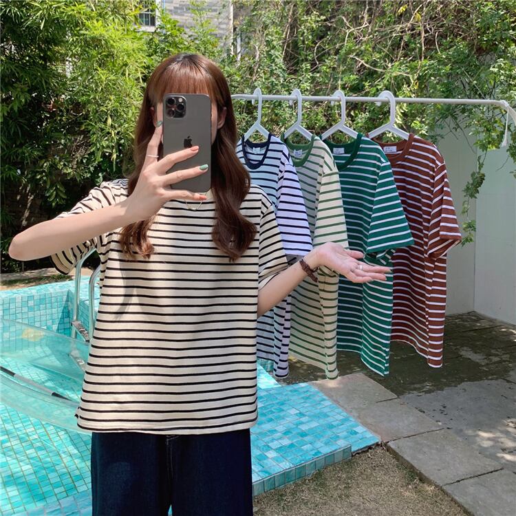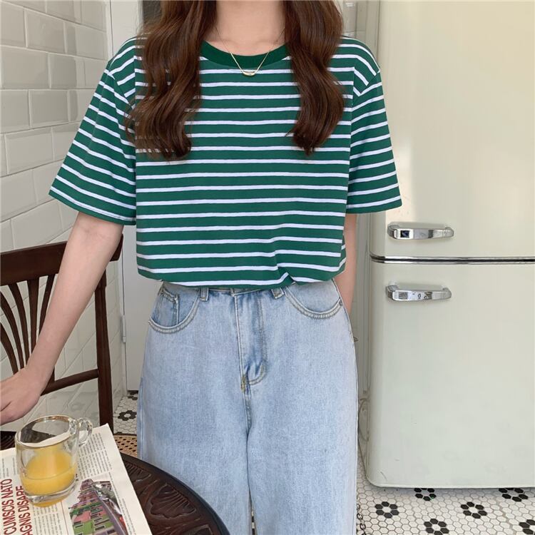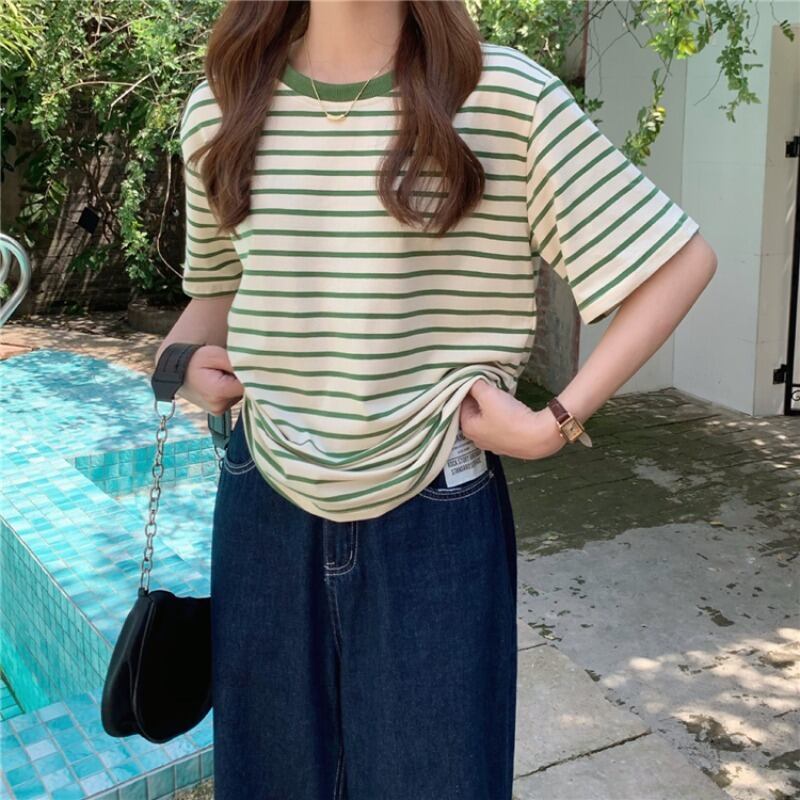 スタンダードラウンドネックルーズ半袖スリーブTシャツ夏服ストライプトップス ショート レトロ ハーフスリーブ 夏物 Oネック シルク コーデ Marchs27996350390