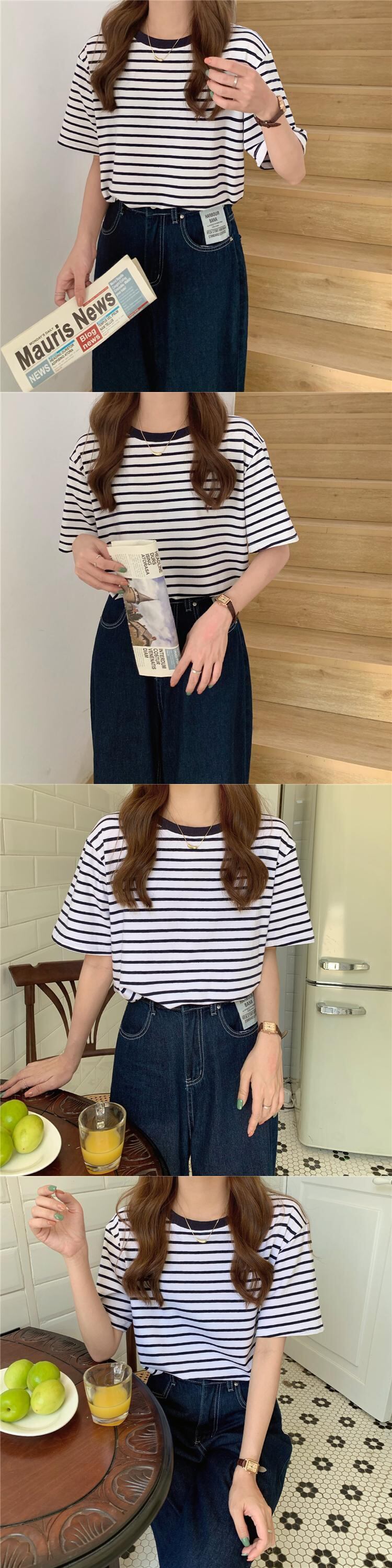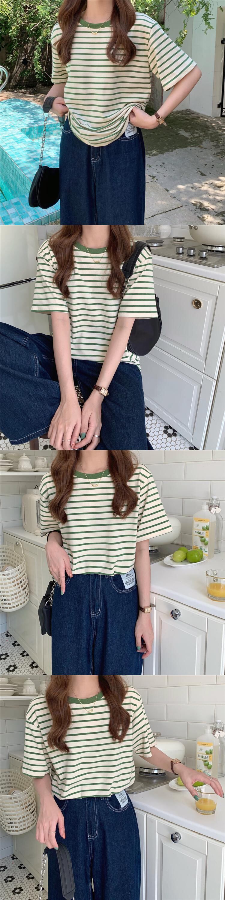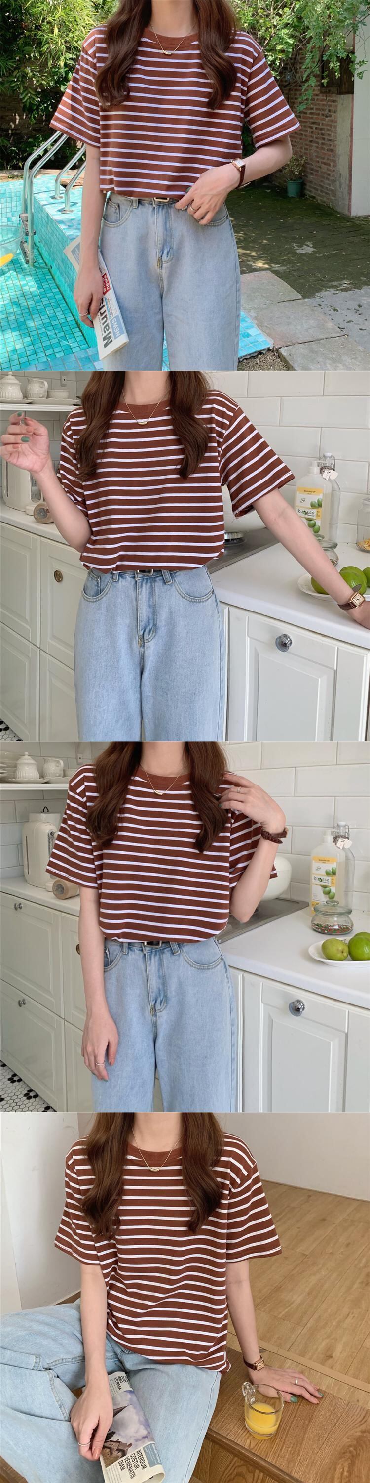 スタンダードラウンドネックルーズ半袖スリーブTシャツ夏服ストライプトップス ショート レトロ ハーフスリーブ 夏物 Oネック シルク コーデ Marchs27996350390