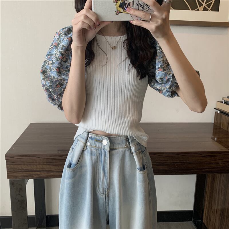 フローラルTシャツトップス スプリング夏服スタイル 春物 夏物 花柄 ステッチ パフスリーブ コーデ Marchs62389305308