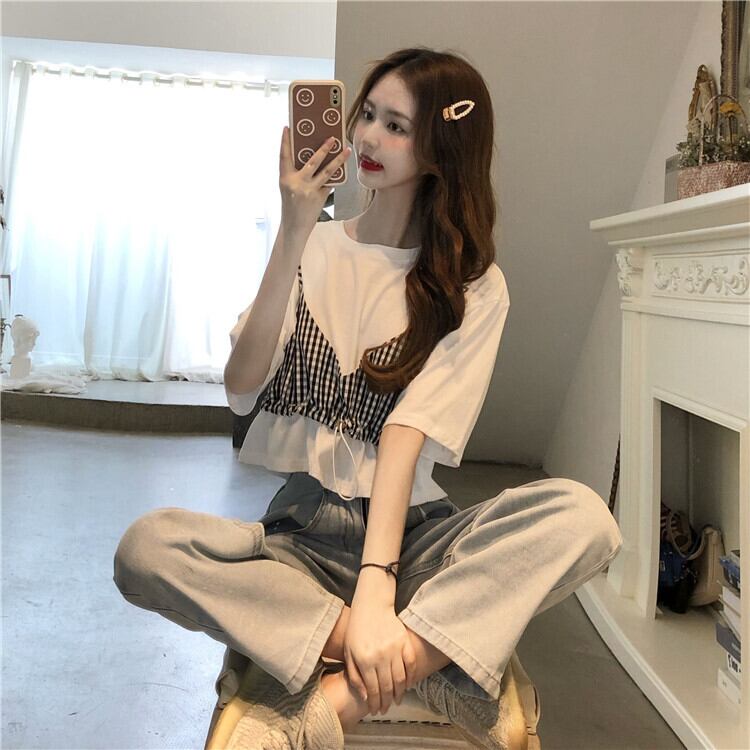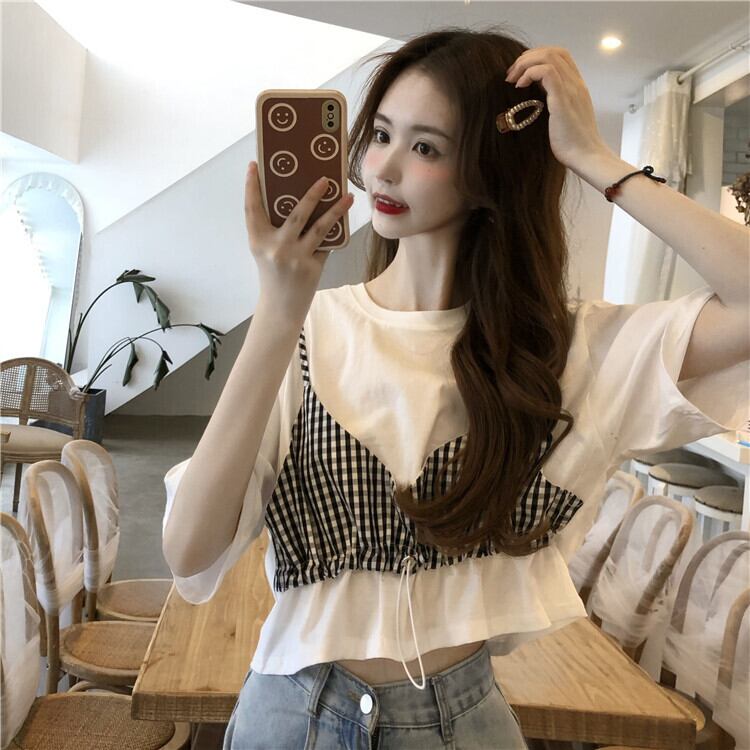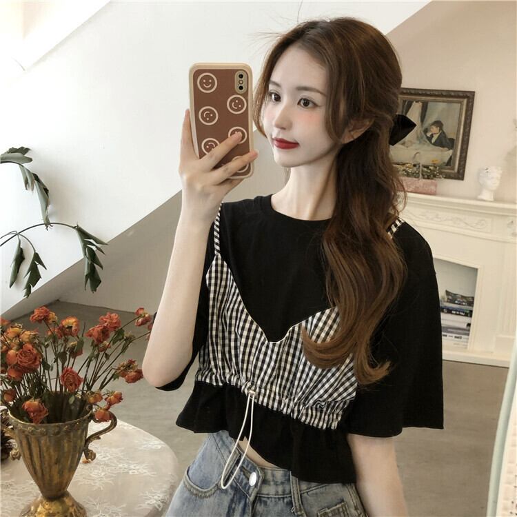 格子柄ショートTシャツ夏服ルーズトップス 夏物 ステッチ コーデ Marchs84537467484