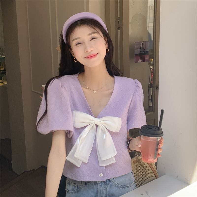 リボンVネックスリーブシャツ 夏服ショートトップス 夏物 パープル コーデ Marchs24598373212