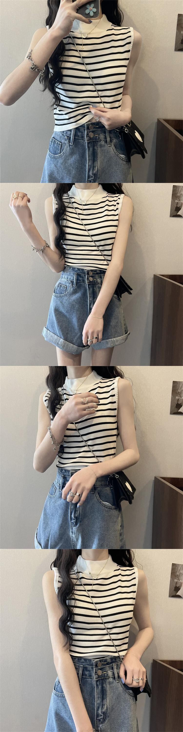 ストライプニット夏服スタンダードスタイルカラーノースリーブTシャツトップス レトロ 大人ガーリー スウィート キュート カジュアル 夏物 ウエスト コーデ Marchs96764348499