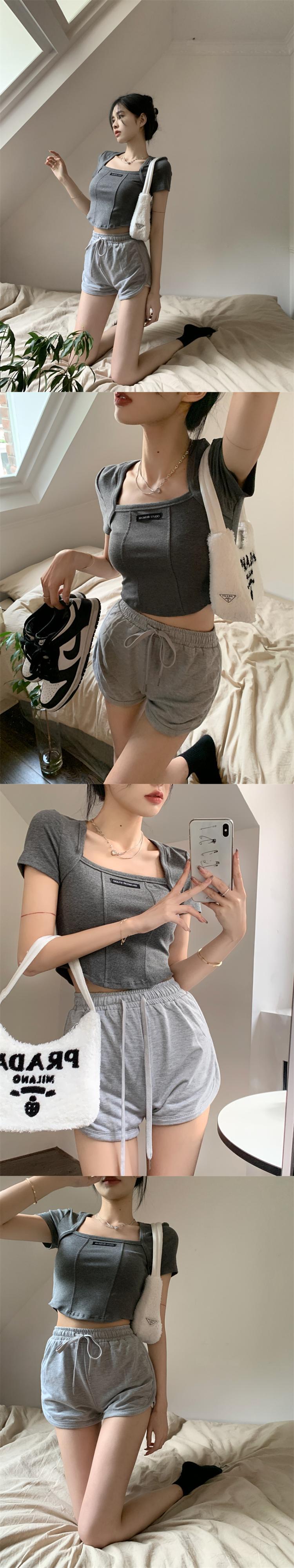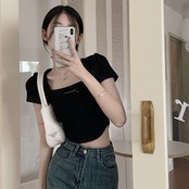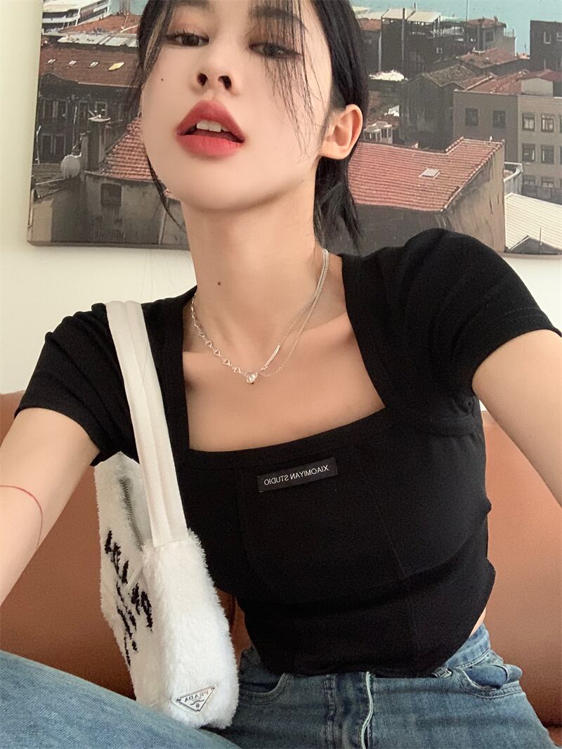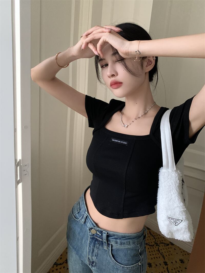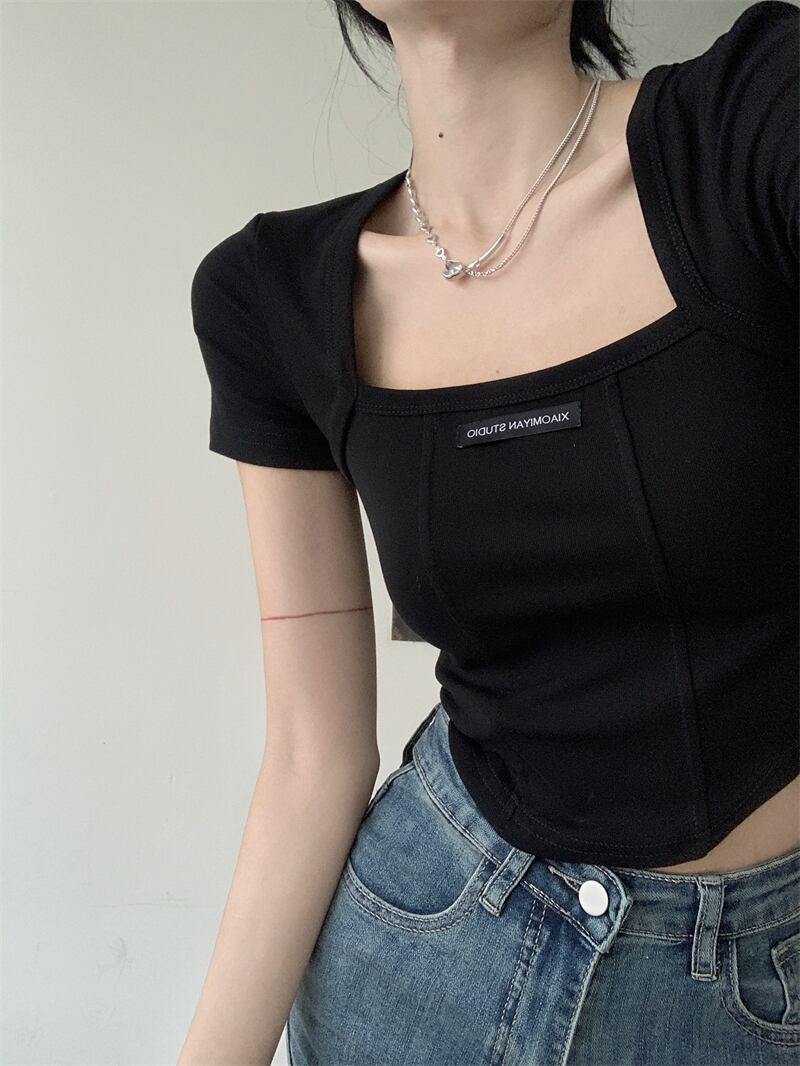 ショートTシャツハイウェストウェストスリムカラートップス 夏服 夏物 ピュア スクウェア ウエスト コーデ Marchs12909550134