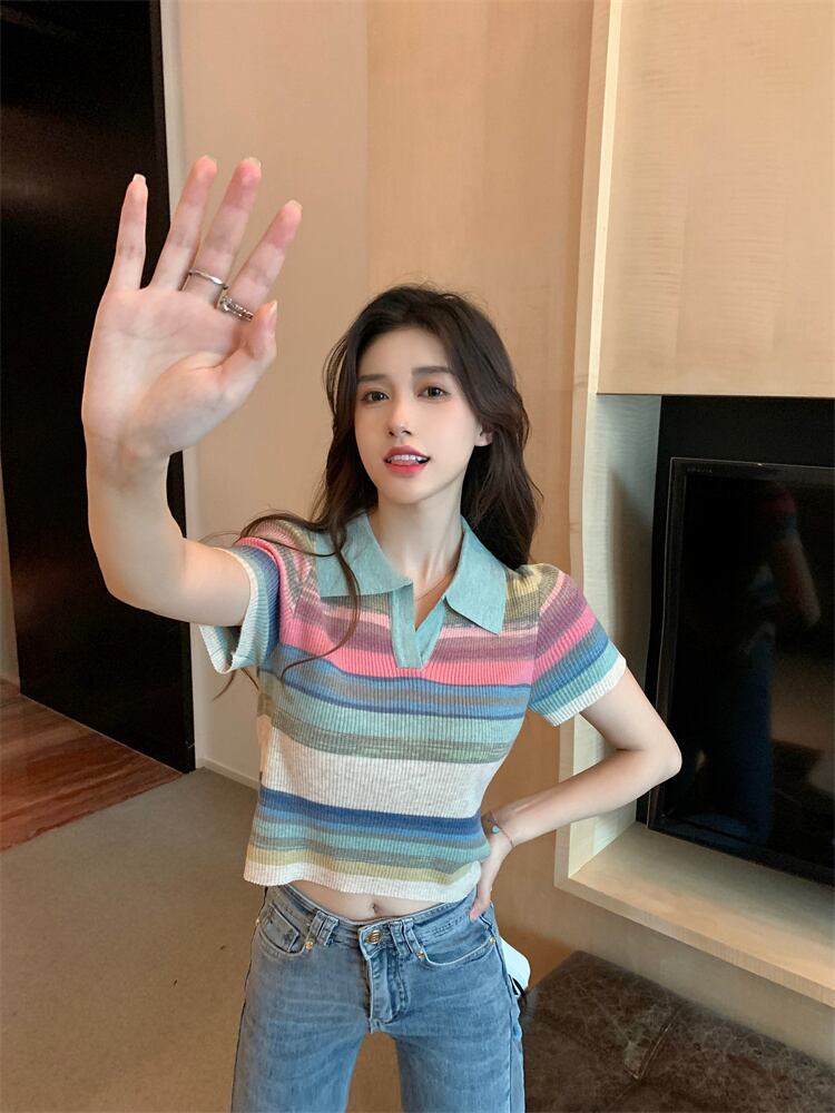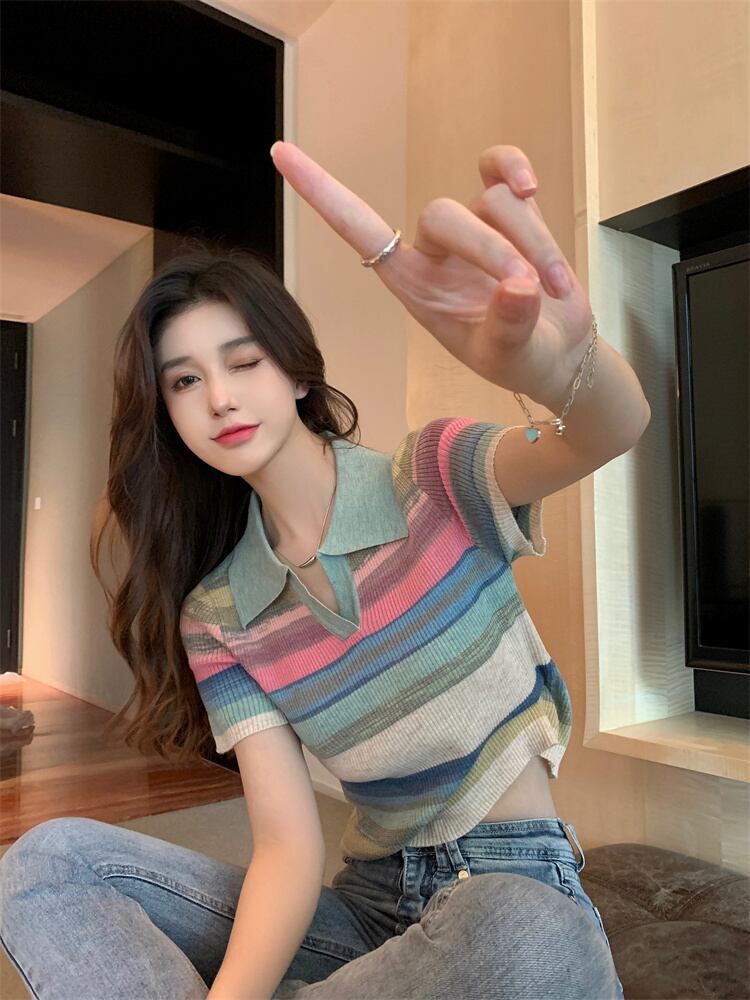 ストライプカラーニットセーター 薄手夏服スタンダード半袖スリーブトップス ショート レトロ ハーフスリーブ 夏物 シルク コーデ Marchs74753445735