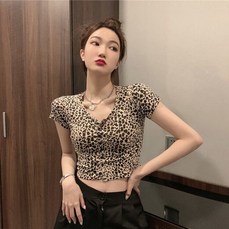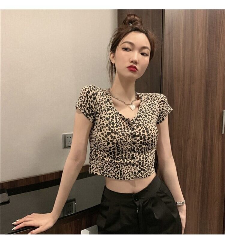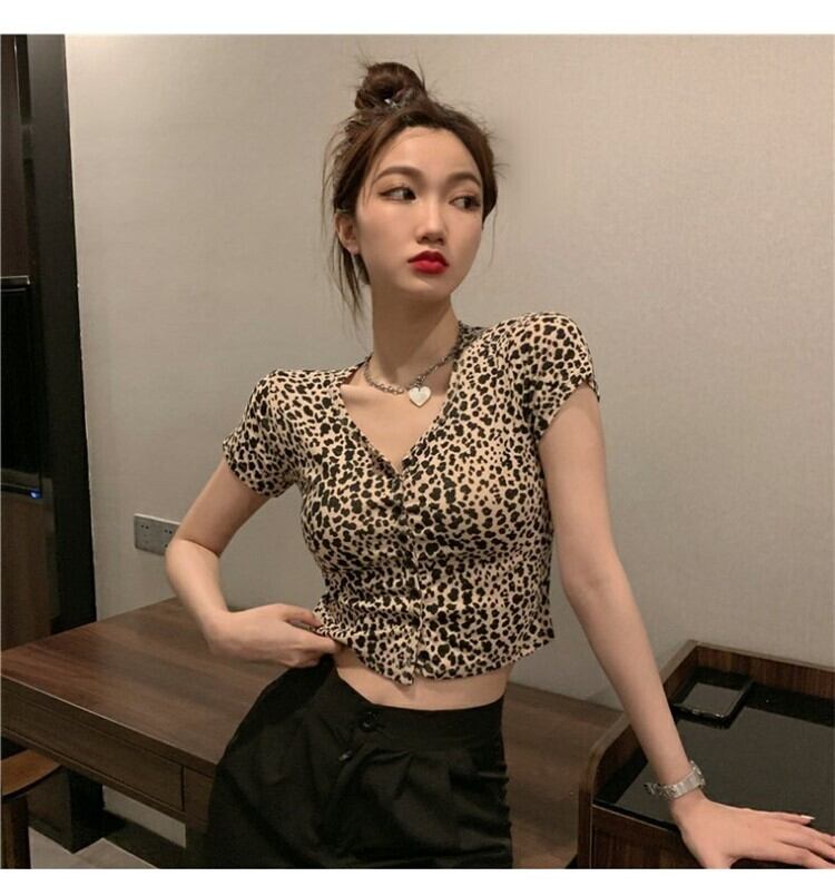 ショート夏服スリムVネックレオパードプリント柄トップス NEW 大人ガーリー スウィート キュート カジュアル 夏物 ピュア コーデ Marchs67120411515