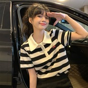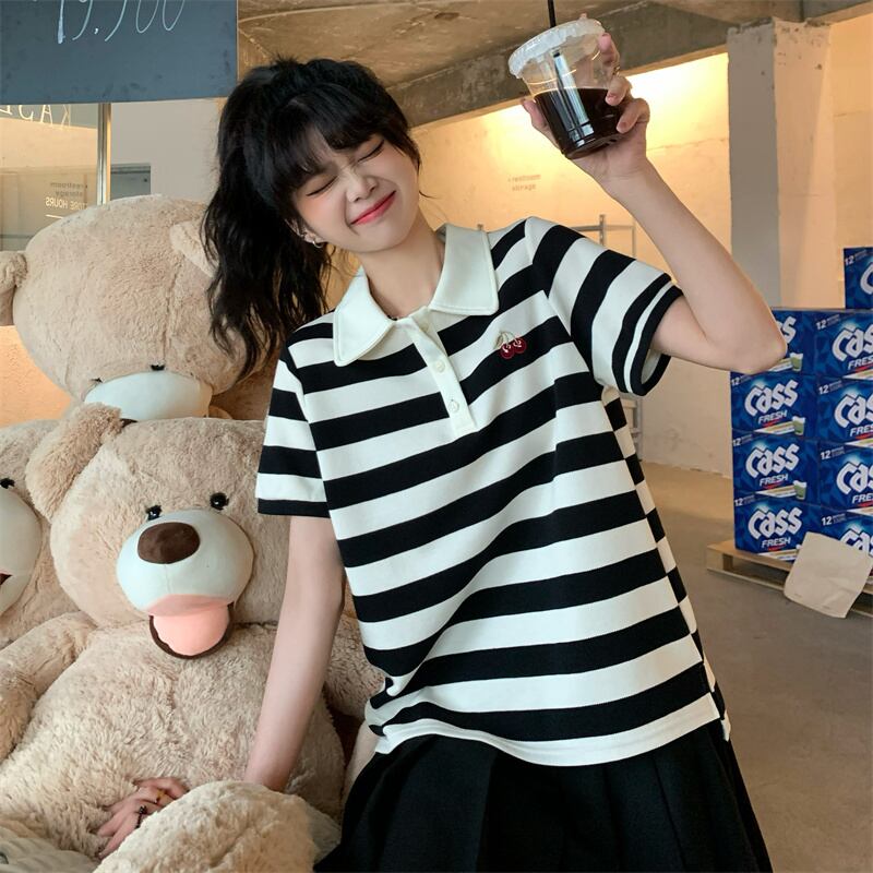 刺繍カラーストライプTシャツ夏服ルーズカジュアルトップス NEW 夏物 コーデ Marchs19055757762
