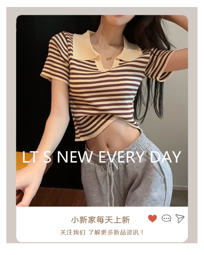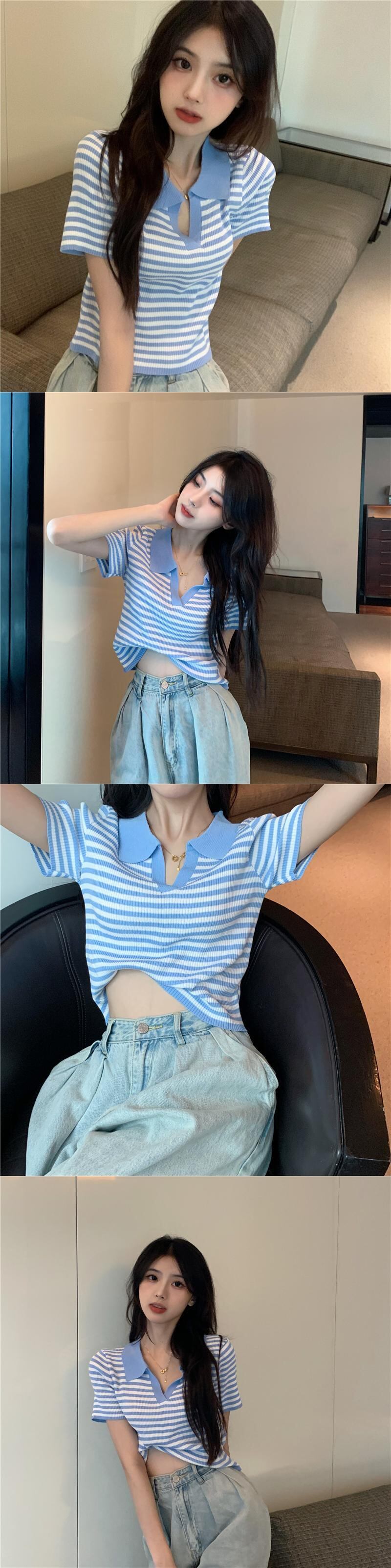 ストライプTシャツ夏服薄手カラー半袖スリーブウェストニットセーター トップス ショート ハーフスリーブ 夏物 シルク ウエスト コーデ Marchs39348960475
