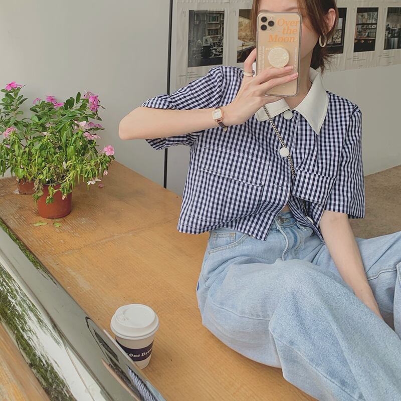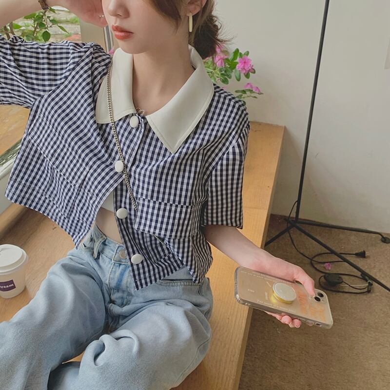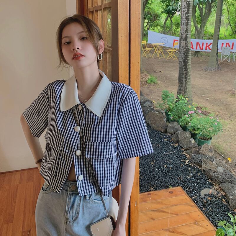 ショート格子柄トップス 夏服ハイウェストスタンダードカラーシャツ レトロ 夏物 ウエスト コーデ Marchs3218451867