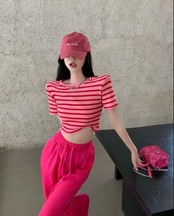 ストライプショートTシャツレディースNEW夏服ハイウェストウェストクロップドトップス ピンク 夏物 ウエスト コーデ Marchs47249959536