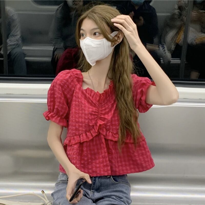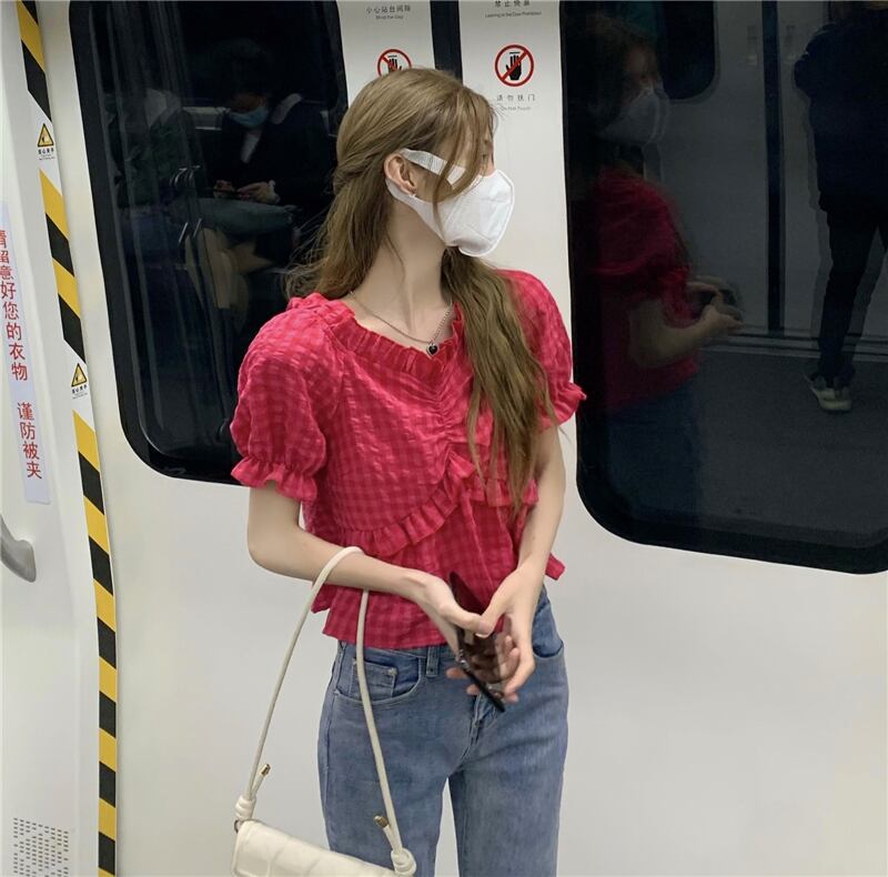 カラーリボンシャツ 夏服格子柄スリーブショートトップス 夏物 コーデ Marchs82054351097