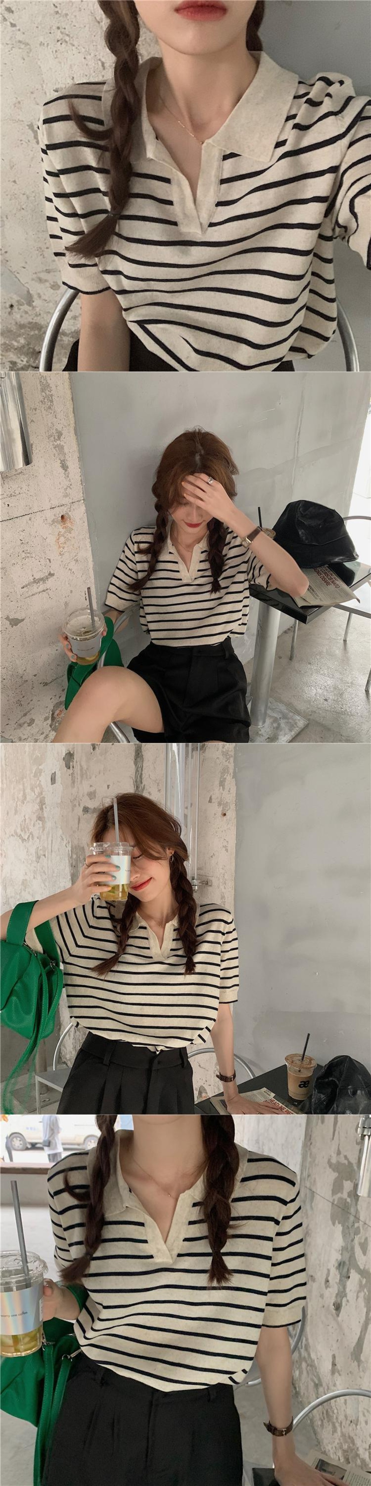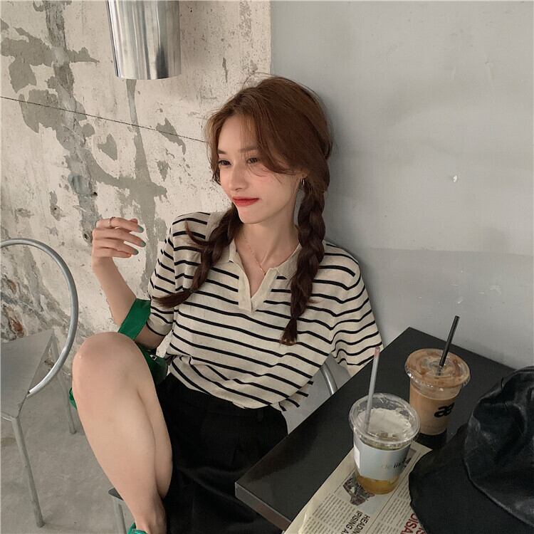 夏服薄手韓国ファッションルーズVネックショートストライプニットゆったりトップス 夏物 スタイル コーデ Marchs27630978277